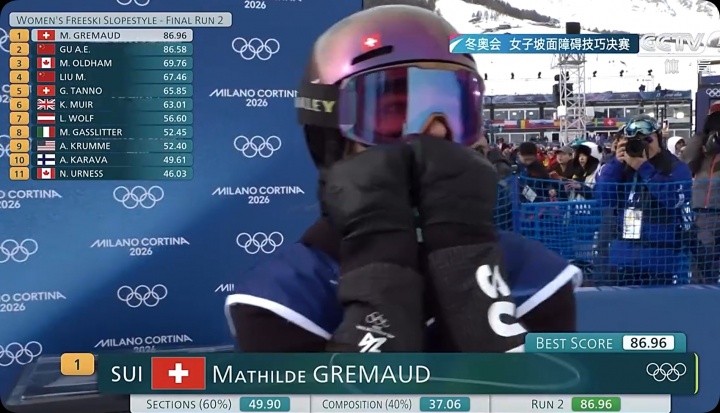 直播吧02月09日讯北京时间2月9日晚,米兰冬奥会女子自由式滑雪坡面障碍技巧项目决赛,最终瑞士选手玛蒂尔德·格雷莫德凭借第二滑的86.96分成功卫冕,谷爱凌第1滑得到86.58分,连续第二届冬奥会获得银牌。