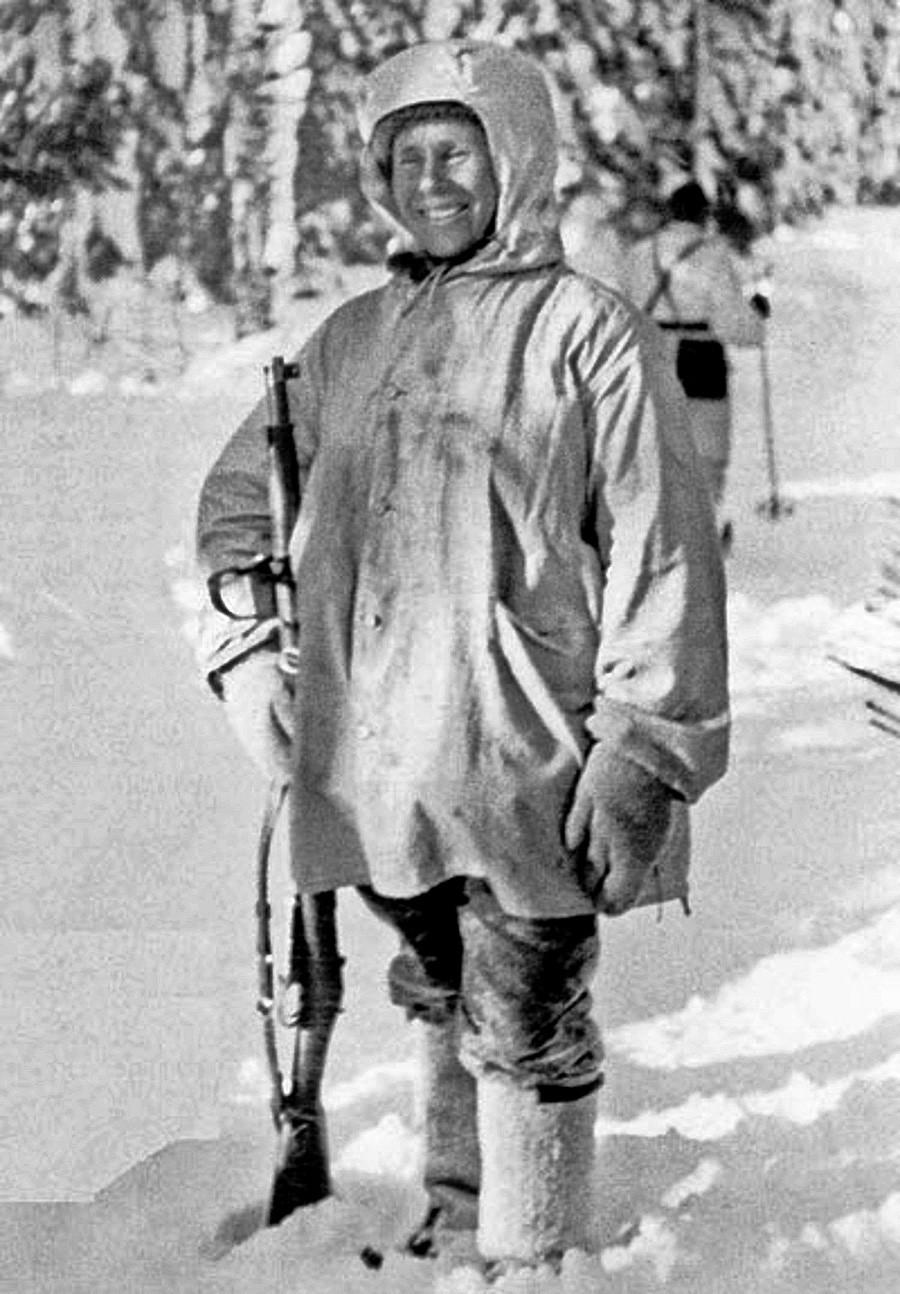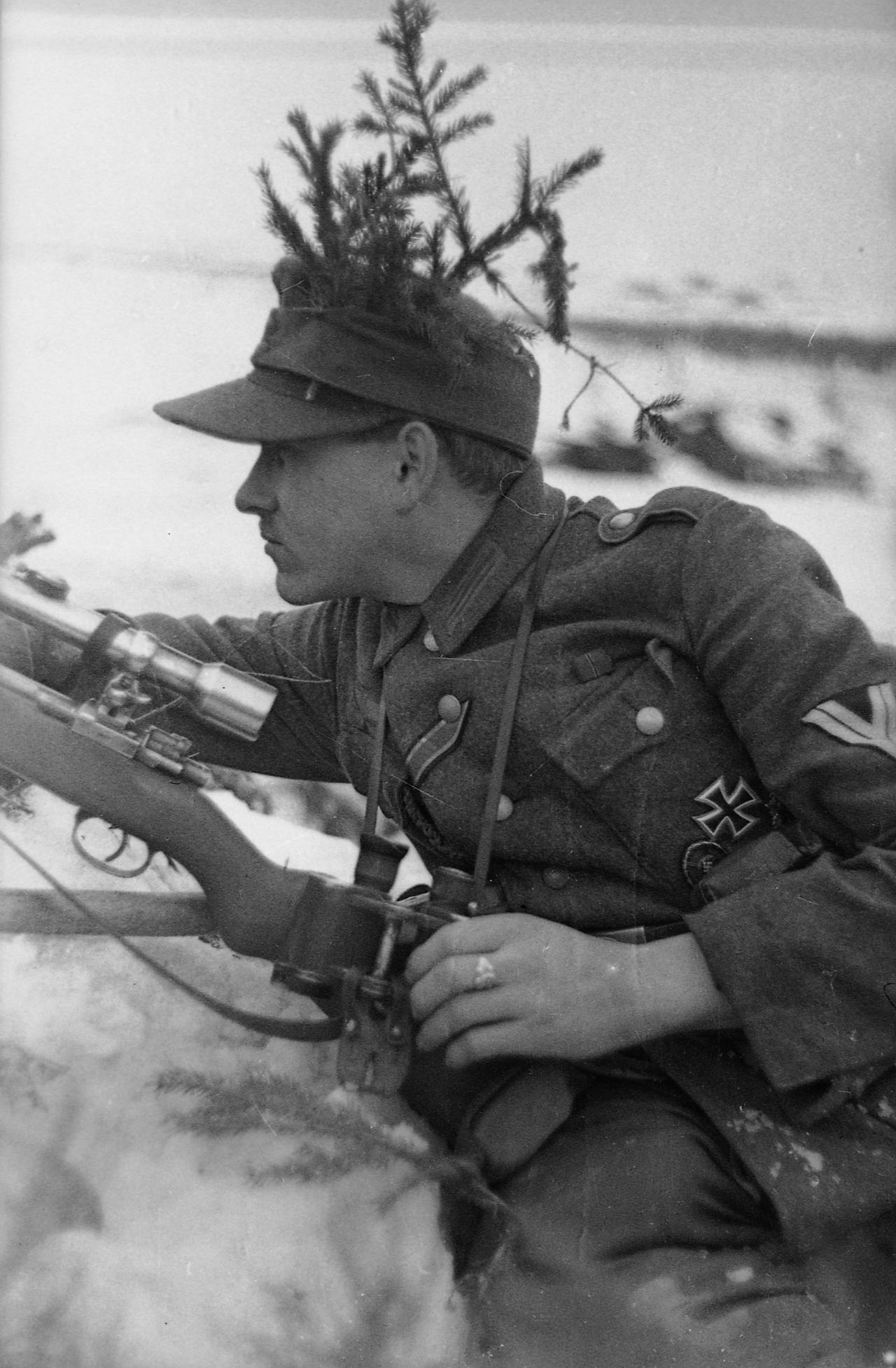 1944 年,东线。一名德军狙击手正在雪地里待命。他在自己的军帽上插上了云杉枝进行伪装。冰天雪地,他应该向苏军同行那样穿上雪地伪装服。当然,苏军是被芬兰同行(参见图2)一顿教育后才学会的。 他手中的应该是 Kar98k 狙击型步枪,配 4 倍 ZF39 瞄准镜,枪支和光学瞄具都加工精良,组合起来是精准而致命的武器。