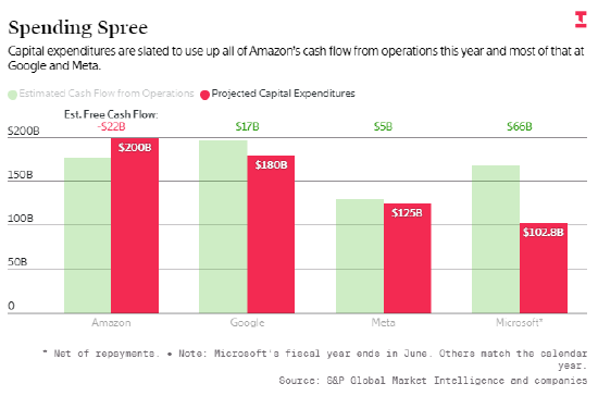 亚马逊则无需面临这一难题:该公司自2022年起便未进行过股票回购,且从未实施过分红。但据标普全球市场情报数据显示,亚马逊今年计划资本支出达2000亿美元,高于分析师预估的1780亿美元经营活动现金流,这意味着与其他两家企业不同,亚马逊今年必然会出现现金消耗。