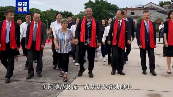 赤坎镇中股村忠心里是司徒暖报当年生活过的地方。在村口的大榕树下,阿迪昂总统见到了他的堂外祖母,81岁的谭惠霞。