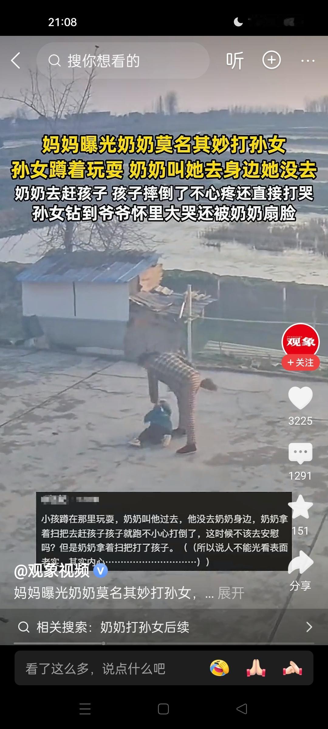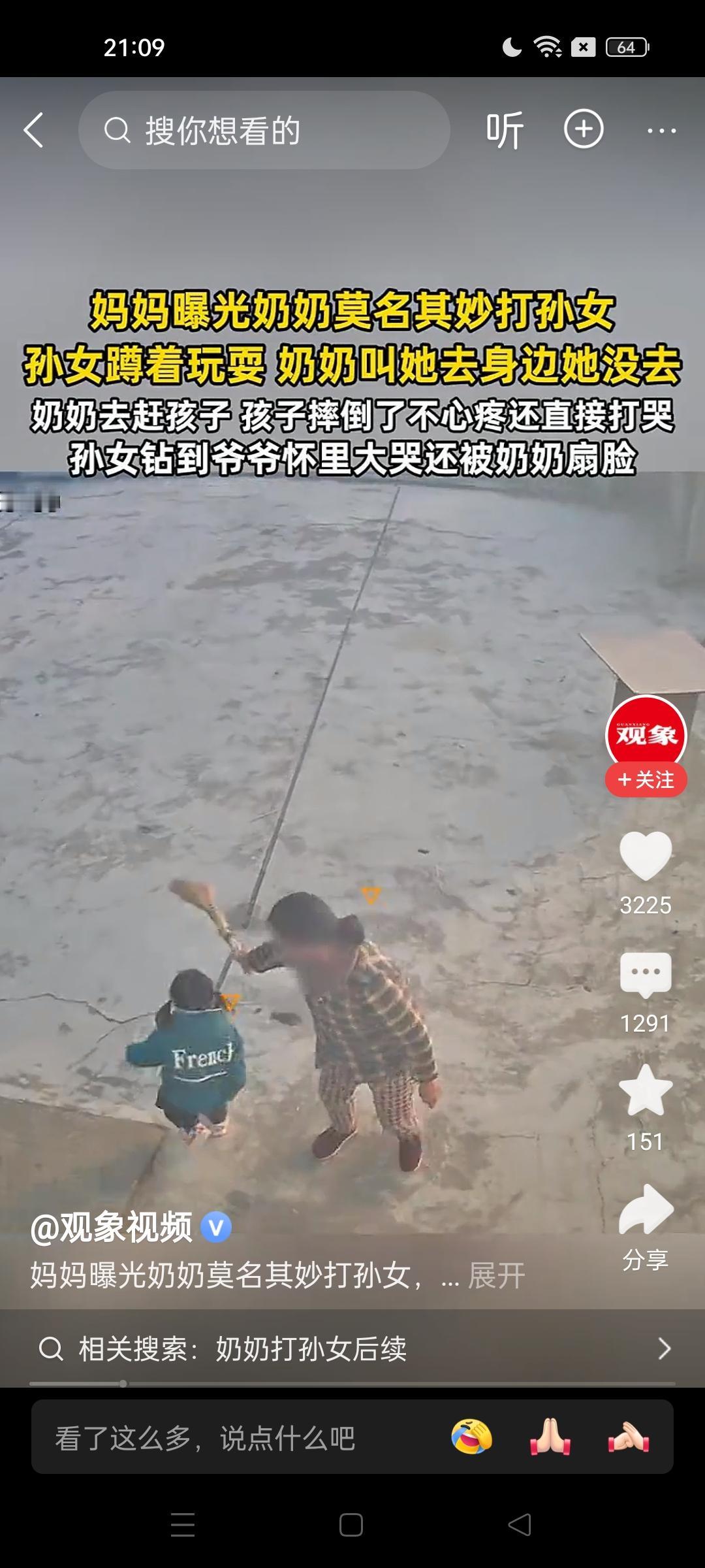 都说隔辈亲,这个奶奶却对孙女下手打! 2月9日,一位广东妈妈,在网上发布视频,指责婆婆的恶行!她说自己在外打工,女儿由婆婆公公带着。可摄像头上看到的一幕,让她觉得很心疼,也很生气! 当时女儿在院子里玩的好好的,婆婆叫她回去,她玩的正起劲,没在意。婆婆随手抄起一个笤帚,要去打女儿。女儿赶紧跑开,不料绊了一跤,倒在地上 ,疼得哇哇大哭。可奶奶走过去后,不仅没有扶起她,反而直接抡起笤帚,用力打在她的腿上! 这还不算完,当自己女儿跑向爷爷求救的时候,奶奶气急败坏,追过去就扇孙女儿耳光,扇了两下,还不解气,还想继续的时候,爷爷告诉她有摄像头,这才停了手! 这个奶奶太暴力,这么一个小小的娃儿,那还不是含在嘴里怕化了捧在手里怕摔了呀!她却反其道而行之,别人疼娃儿我打娃儿,笤帚打完巴掌扇,都说奶奶最慈祥,偏要化身母夜叉! 这今后和儿媳妇还怎么处?老了需要用人了还能怎么办?到时候孙女会不会说:来打我塞![捂脸][捂脸][捂脸]