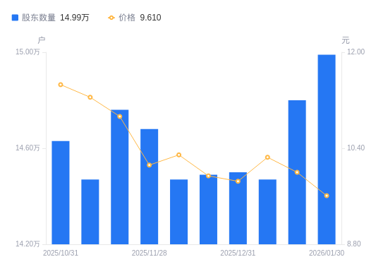 日期A股户数(户)流通A股户均持股数(股)户均持股市值(万元)2026-01-3014990017184.9316.512026-01-2014800017405.5417.412026-01-0914470017802.4918.252025-12-3114500017765.6617.502025-12-1914490017777.9217.672025-12-1014470017802.4918.322025-11-2814680017547.8217.762025-11-2014760017452.7119.082025-11-1014470017802.4920.032025-10-3114630017607.8020.18