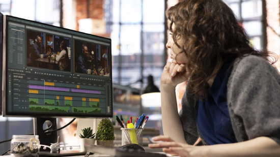 在广告公司办公室,一位专注的女编辑正使用创意软件制作视频混剪,深耕数字媒体领域。这位影视从业者借助双显示器剪辑素材、创作内容,开展后期制作工作。