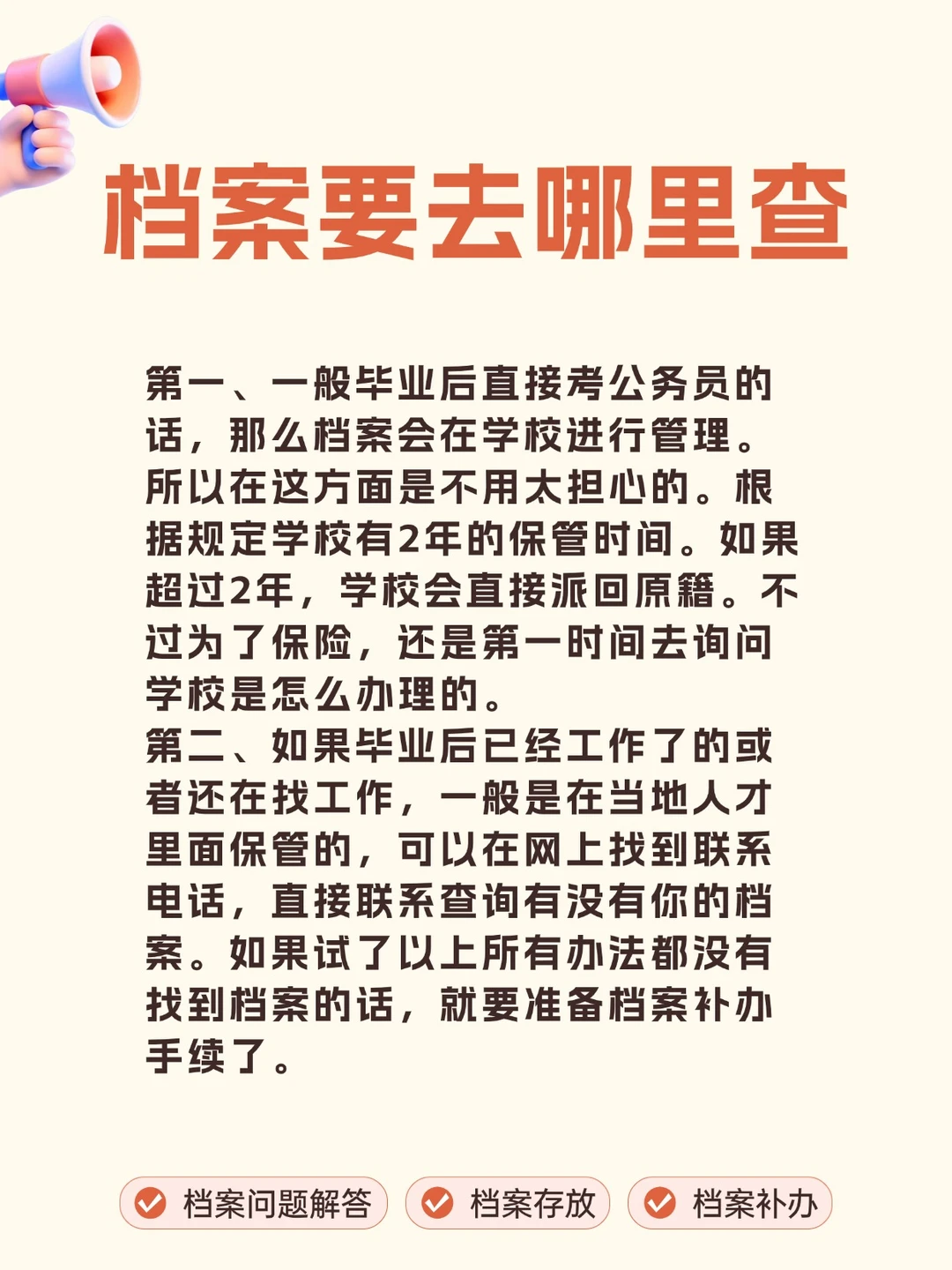 [彩虹R]第一、一般毕业后直接考公务员的话,那么档案会在学校进行管理。所以在这方面是不用太担心的。根据规定学校有2年的保管时间。如果超过2年,学校会直接派回原籍。不过为了保险,还是第一时间去询问学校是怎么办理的。