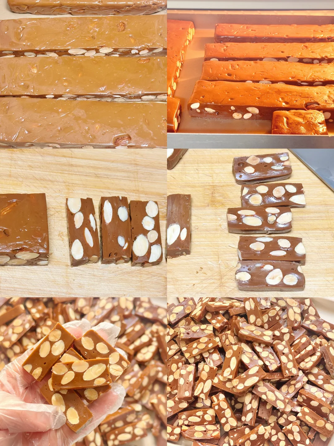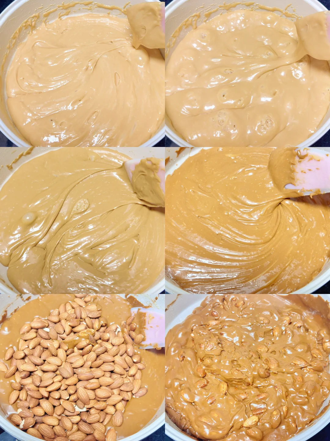 3️⃣趁热倒入杏仁翻拌均匀,再放入不粘烤盘中整型,晾至90度左右就可以开始切块。放凉后就可以包装存放。