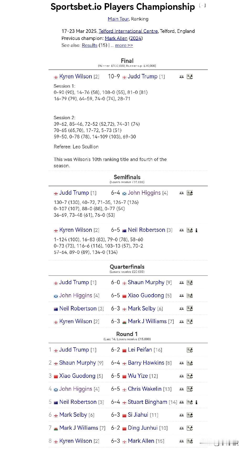 球员锦标赛首轮对阵是根据单赛季排名自动落位。今年5名中国球员获得资格,参赛人数与去年持平,但换了3个人,希望今年成绩超过去年。 去年中国参赛球员是:肖国栋、吴宜泽、丁俊晖、斯佳辉和雷佩凡,今年肖国栋和吴宜泽继续获得资格,而丁俊晖、斯佳辉和雷佩凡没有获得资格,代之而战的是赵心童、张安达和周跃龙。 成绩对比,去年第二轮只有中国球员肖国栋一人晋级,而且是在内战中击败吴宜泽,今年没有中国德比。 经过世界大奖赛一战,现在都不好预测中国球员的战绩,毕竟世界大奖赛中国球员超水平发挥,并非常态,何况球员锦标赛参赛球员都是本赛季表现最好的,因此不要用世界大奖赛的结果来预测中国球员的成绩。 从首轮对阵看,有2-3名中国球员晋级第二轮就算不错。首轮对阵如下: 尼尔·罗伯逊vs希金斯 肖国栋vs韦克林 周跃龙vs特鲁姆普 马克·威廉姆斯vs霍金斯 张安达vs墨菲 赵心童vs斯莱塞 吴宜泽vs艾伦 塞尔比vs利索夫斯基。 球员锦标赛是排名赛,也是红包赛,2月17日开打,第一轮即使输球,也可以拿到1.5万英镑奖金,而且积分计入排名。 晋级8强可以拿2万英镑,4强可以拿3.5万英镑,进决赛可以拿7万英镑,冠军15万英镑。 球员锦标赛的赛制,半决赛之前都是11局6胜,决赛19局10胜。去年的冠军是凯伦·威尔逊,他在决赛中10-9险胜特鲁姆普。遗憾的是,凯伦·威尔逊今年没有获得参赛资格。