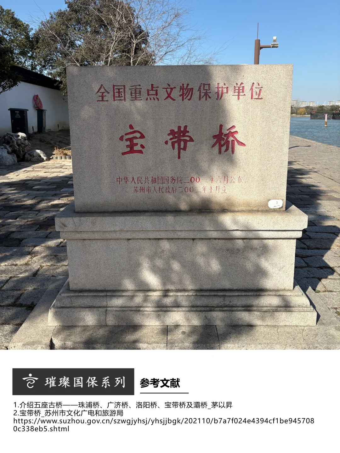 宝带桥与京杭大运河平行,位于运河与澹台湖之间的玳玳河口,交通地位重要,是中国古代十大名桥之一,也是我国现存最长、保存最完整的一座大型古代连拱石桥,被誉为“苏州第一桥”。据《苏州府志》记载,宝带桥由唐刺史王仲舒主持建造,南宋时期坍塌并重建,明正统十一年(公元1446年),宝带桥重新建设,形制与规模多基本沿袭至今。宝带桥绵长而雄伟,有长虹卧波之气势。宝带桥的“多铰拱”及“被动压力”的利用为世界各国所罕见者。
