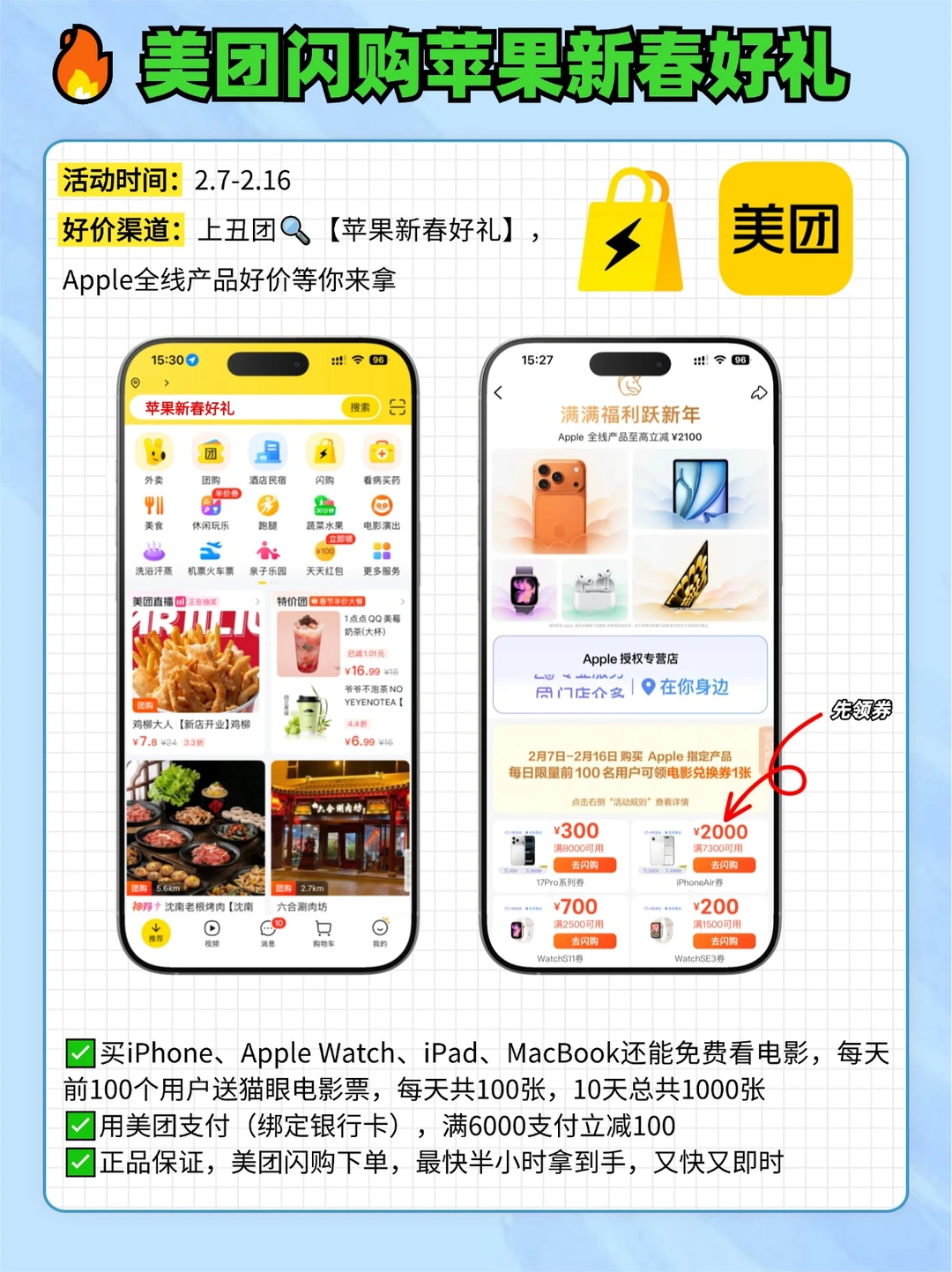 建议上MT🔍【苹果新春好礼】,跳转会场领优惠,苹果全线产品至高立减2100元,还能免费get春节电影票和家人朋友看电影。