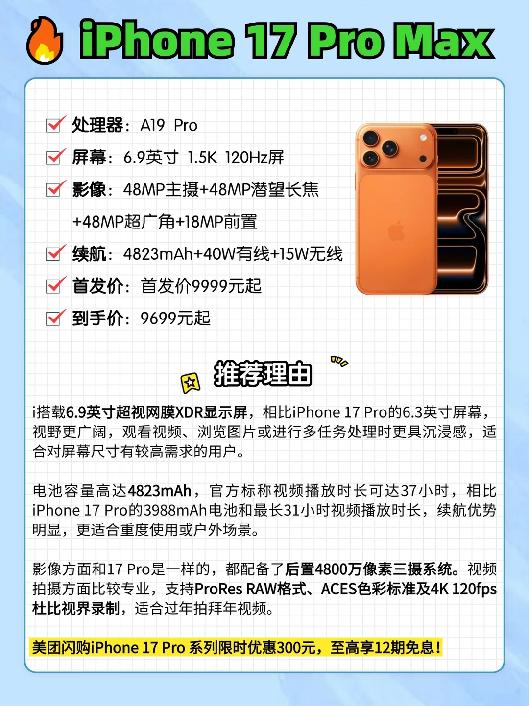 17系列四款手机中,推荐iPhone 17 Pro和iPhone 17 Pro Max,直接一步到位。