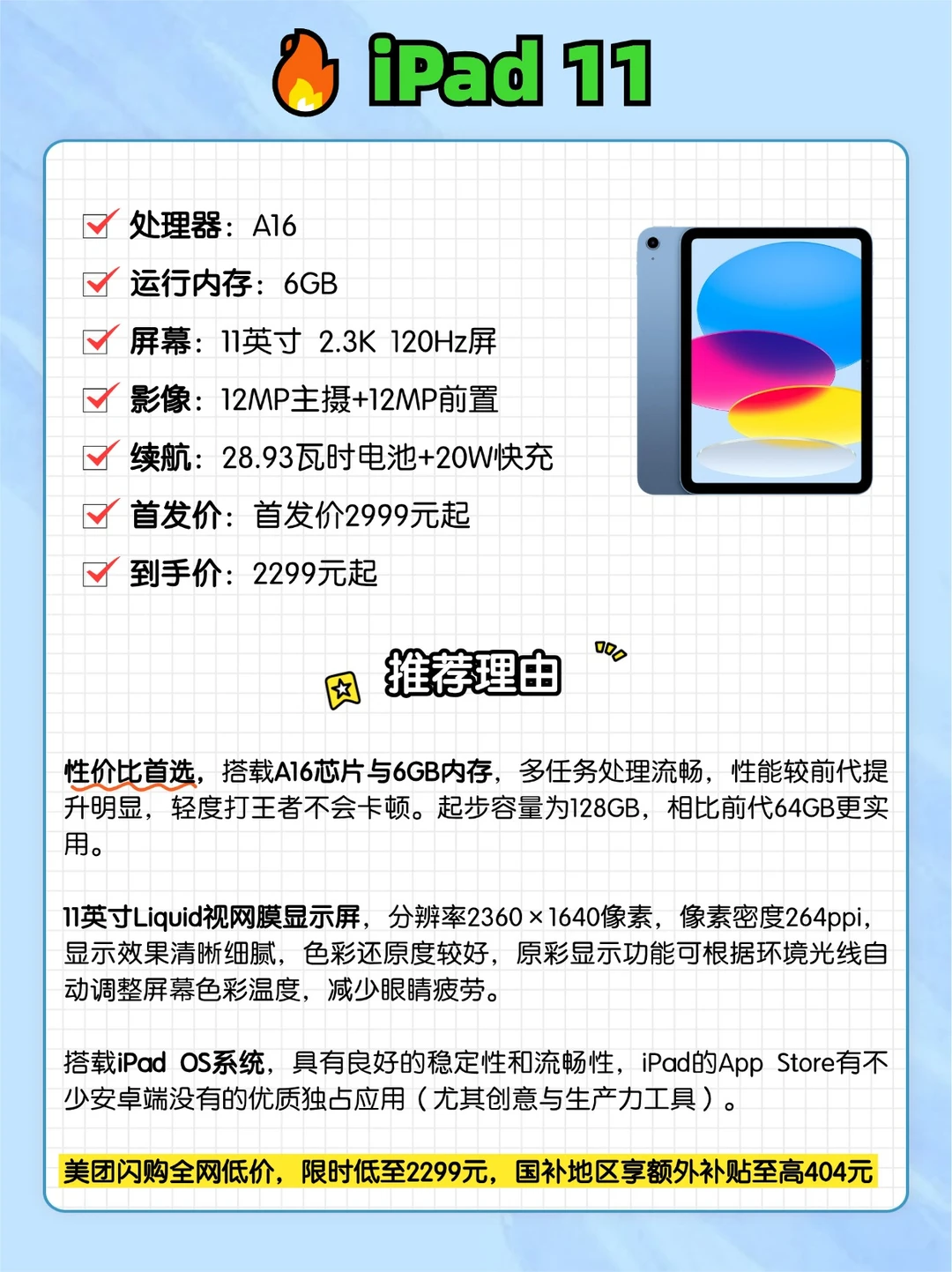 ipad11目前全网低价,限时低至2299元,国补地区享额外补贴至高404元,入手无压力。