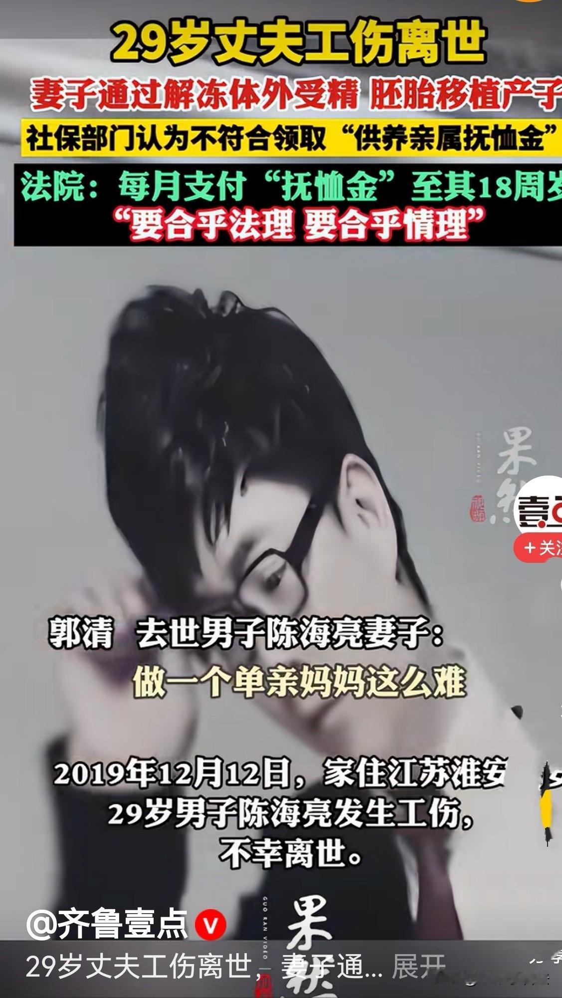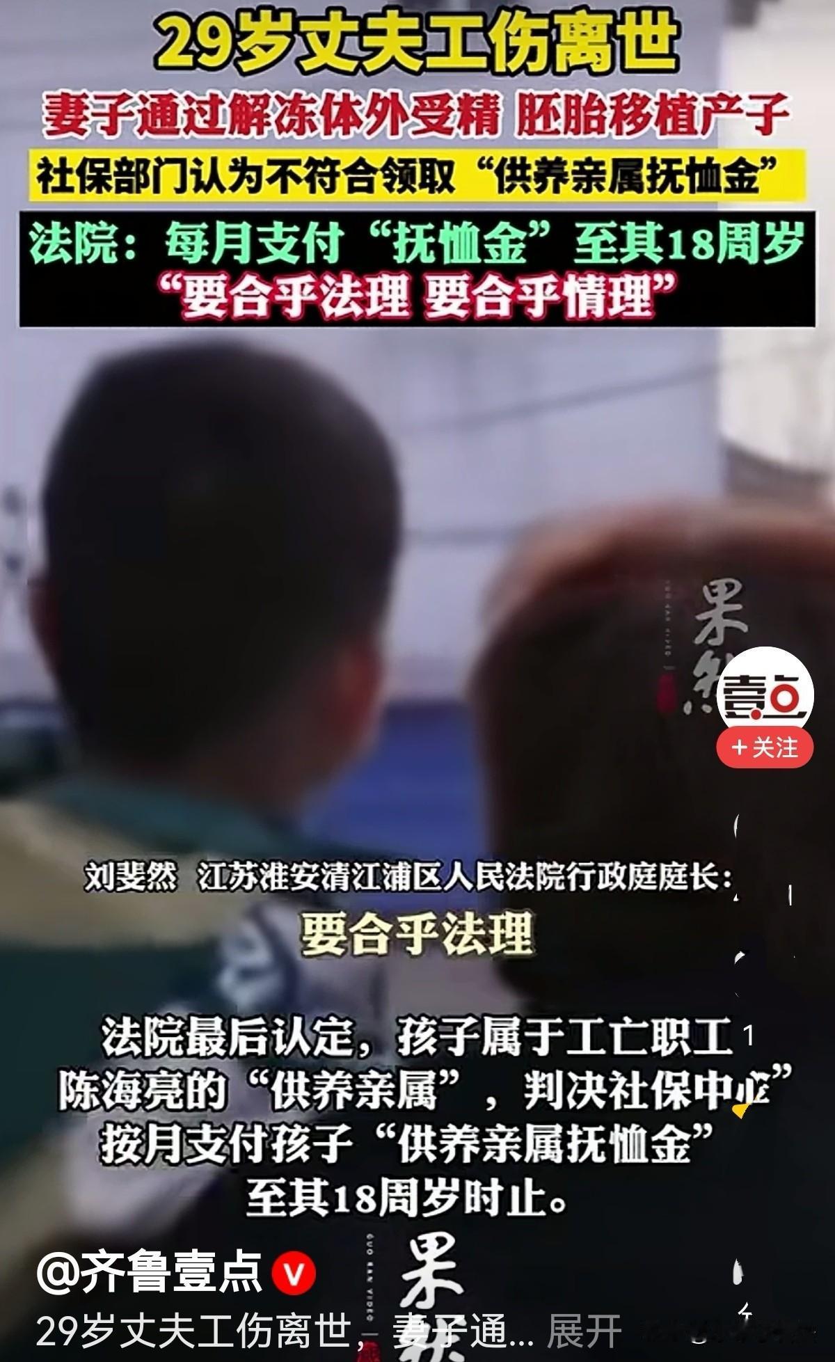 “感人的何止这个妈妈!”江苏淮安,29岁男子在与妻子准备胚胎移植的前3天,突然因工伤离世。妻子强忍悲痛,坚持继续移植并成功生下孩子。生下孩子后,她申请递交“供养亲属抚恤金”申请,遭到社保中心拒绝,他们认为,孩子非“遗腹子”,不应获得工亡抚恤金。妻子无奈起诉至法院,法院判决出乎预料! 陈海亮和妻子郭清是对幸福的夫妻,可唯一的遗憾是结婚多年未育,他们一直渴望拥有一个属于自己的孩子。 因为自然受孕困难,夫妻俩咬牙选择了试管婴儿这条路。 漫长的检查、调理、打针、取卵,每一步都充满了煎熬,却也藏着他们对未来最真切的期盼。 2019年12月9日,夫妻俩终于在医院完成了胚胎冷冻,所有的准备都已就绪,医生定下了移植的日子为12月15日。 陈海亮眼里满是温柔的期待,他常常摸着妻子的手,想象着孩子出生后的模样,想着一家三口团圆的幸福画面。 谁也没有想到,命运的残酷,来得如此猝不及防。 12月12日,距离胚胎移植仅剩三天,陈海亮在工作中遭遇意外,因工伤不幸离世。 刚刚还在憧憬新生命降临的家庭,瞬间被巨大的悲痛吞没。 妻子瘫坐在医院的走廊里,手里攥着那张胚胎冷冻单,眼泪止不住地流。 一边是刚刚离世、尸骨未寒的丈夫,一边是两人用尽全力孕育、还未降生的孩子,她的心像被生生撕裂。 她抱着丈夫的照片彻夜难眠,无数次想要放弃,可一想到那是丈夫留在世上唯一的血脉,是两人爱情最后的延续。 她就咬着牙告诉自己:必须把孩子生下来,这是对丈夫最好的告慰,也是这个家最后的希望。 顶着巨大的精神压力和身体负担,她强忍悲痛,坚持按照原定计划完成了胚胎移植。 10个月的小心翼翼,10个月的孤单坚守,2021年1月,一个健康的宝宝顺利降生。 当听到孩子第一声啼哭时,这位年轻的妈妈泪如雨下,所有的委屈、痛苦、坚持,在这一刻都有了意义。 孩子的眉眼像极了陈海亮,那是他生命的延续,也是这个破碎家庭重新燃起的微光。 郭清说,她当时没想到作为一个单亲妈妈有多难!孩子出生后,生活的现实问题接踵而至。主要是经济问题吧! 作为工亡职工的家属,她代表孩子向当地社保中心提出申请,希望能领取属于孩子的供养亲属抚恤金。 这是工伤保险给予工亡职工家属最基本的保障,也是孩子未来成长路上一份重要的经济支撑。 可让她万万没想到的是,申请递上去,却被直接驳回了。 社保中心给出的理由很明确:孩子在陈海亮去世时,只是医院里的一枚冷冻胚胎,并非法律意义上的“遗腹子”,不符合供养亲属的认定条件,因此不能享受抚恤金。 这句话像一盆冷水,浇灭了她所有的希望。 她无法接受,这个孩子是丈夫生前亲自参与、共同孕育的血脉,只是因为医学流程,才没能在丈夫在世时降生。 难道仅仅因为是试管婴儿,仅仅是以胚胎的形式存在,孩子就不配拥有父亲留下的保障吗? 为了给孩子讨一个公道,她毅然拿起法律武器,以孩子的名义将社保中心告上法院。 法庭上,双方围绕“冷冻胚胎孕育的子女,是否属于工亡职工供养亲属”展开了激烈的争辩。 法院审理格外慎重,他们要考虑到既要合乎法理,又要合乎情理。 《民法典》第16条规定:涉及遗产继承、接受赠与等胎儿利益保护的,胎儿视为具有民事权利能力。但是,胎儿娩出时为死体的,其民事权利能力自始不存在。 法院审理认定,这个孩子虽不属于传统的遗腹子概念,但是不可否认的是,他和陈海亮 有着无可辩驳的生物学父子关系。 胚胎的受精、培育全部完成于陈海亮生前,移植只是医学程序的延后,与传统遗腹子在本质上没有任何区别。 《民法典》第1071条规定:非婚生子女享有与婚生子女同等的权利,任何组织或者个人不得加以危害和歧视。 孩子作为陈海亮的亲生子女,理应享有同等的权利,不能因为孕育方式的不同,就被剥夺应有的保障。属于工亡职工生前需要供养的亲属范围。 《工伤保险条例》第39条第1款第2项:职工因工死亡,其近亲属按照下列规定从工伤保险基金领取丧葬补助金、供养亲属抚恤金和一次性工亡补助金:(二)供养亲属抚恤金按照职工本人工资的一定比例发给由因工死亡职工生前提供主要生活来源、无劳动能力的亲属。 最终法院判决:撤销社保中心的拒绝决定。 判令社保中心一次性支付2021年1月至2025年3月的抚恤金共计60152.76元,并从2025年4月开始,每月支付约1950元,直到孩子年满18周岁。 有人说,这个看啥时候发生,如果去世时候就生了,那按规定给,如果去世后生的,是不能给。 有人说,这个女人是个有情有义的好妻子,在丈夫去世后还继续完成胚胎移稙,给丈夫留下后代,应该给予支持。 对此您怎么看?
