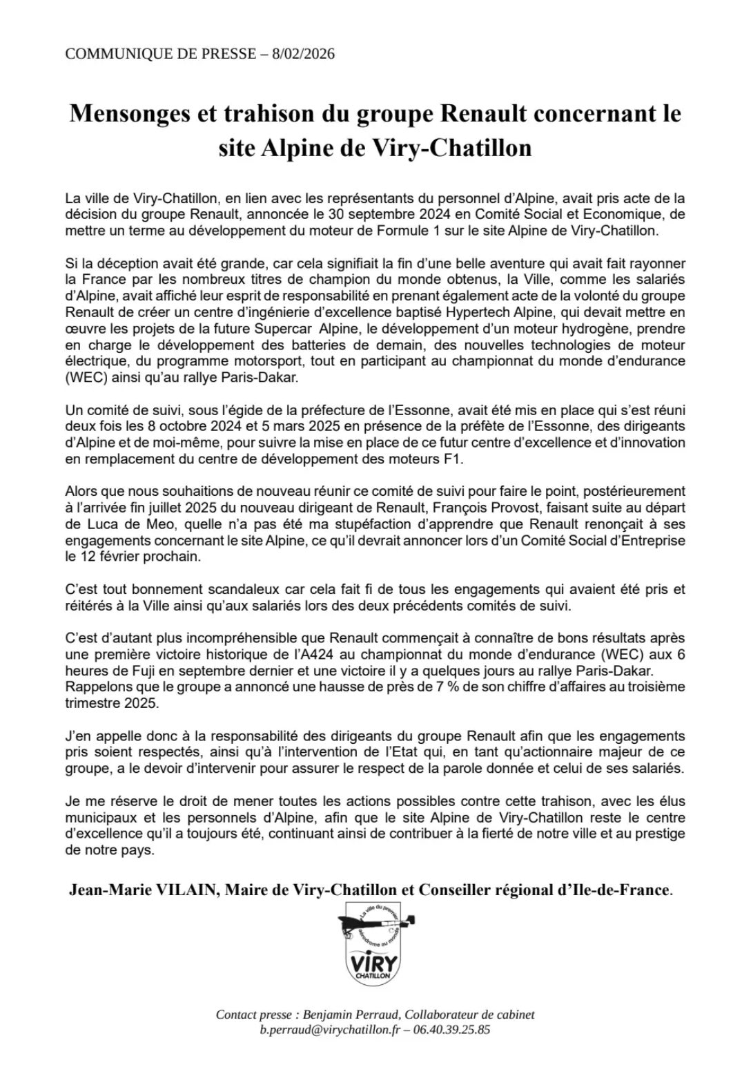 他强调:“我将保留与市政代表以及 Alpine 员工一道,采取一切可能行动的权利,反对这一背叛行径,确保 Viry-Châtillon 基地继续作为 Alpine Hypertech 存在,延续其对城市自豪感与国家声望所作出的贡献。”