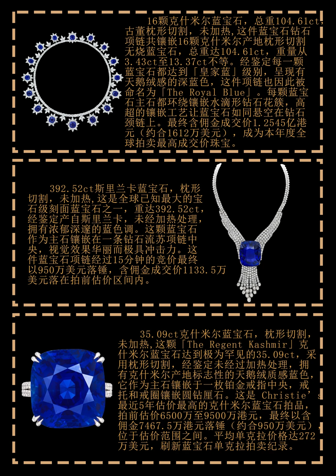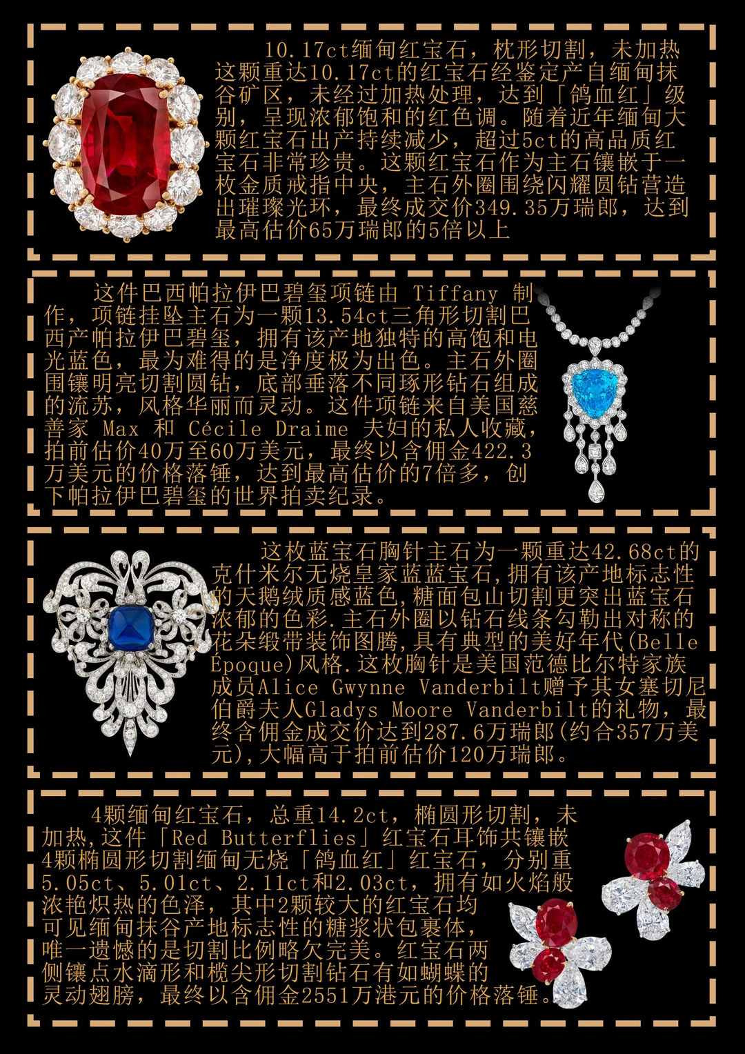 2025年彩色宝石拍卖整体呈回升趋势,高品质蓝宝石的表现尤为突出,共有2件蓝宝石珠宝突破千万美元;红宝石因缺少重量级拍品亮相,上榜数量明显减少;祖母绿和翡翠的热度受亚洲买家保守心态影响而明显回落,本年度仅有1件翡翠珠宝上榜。
