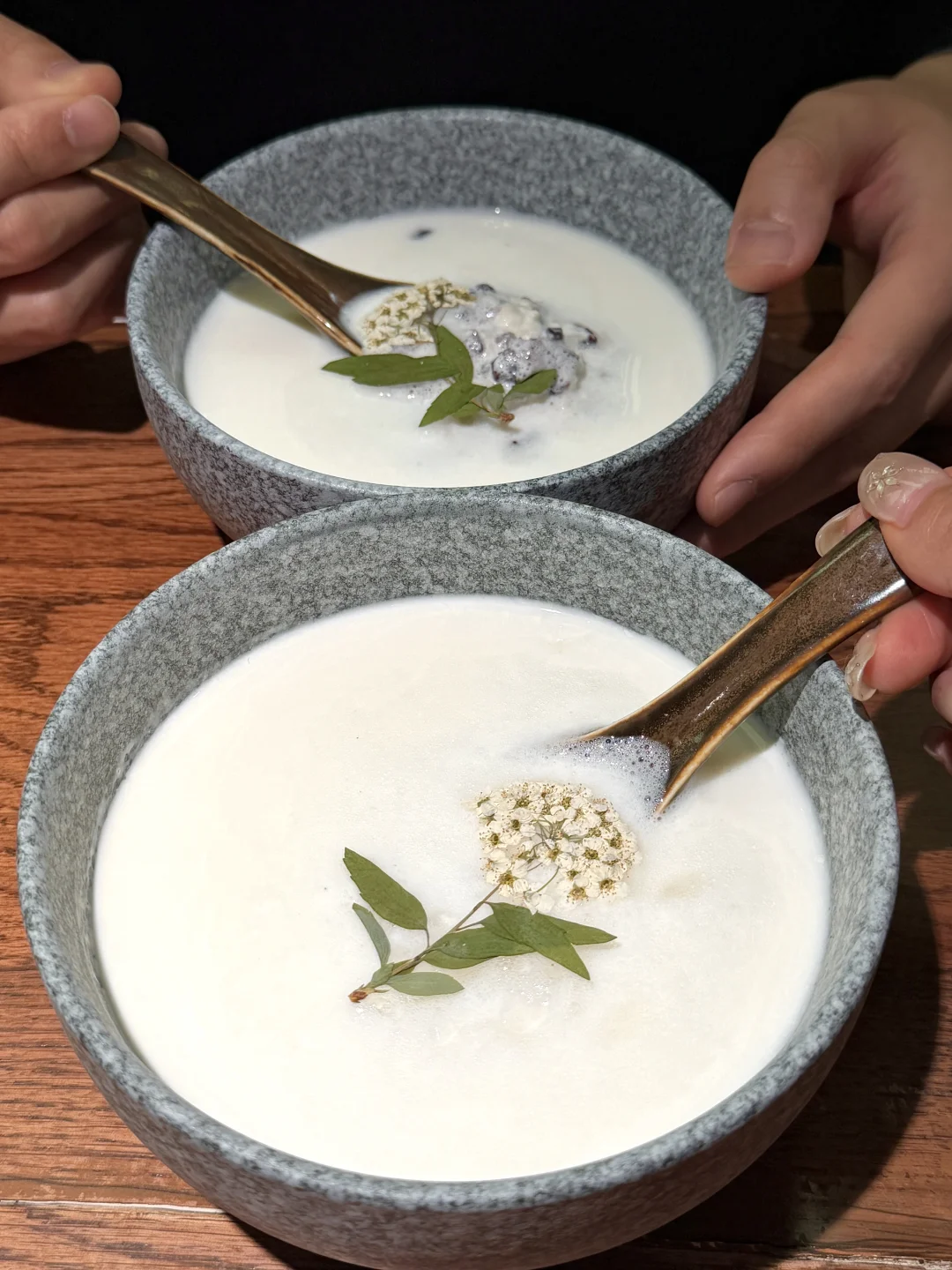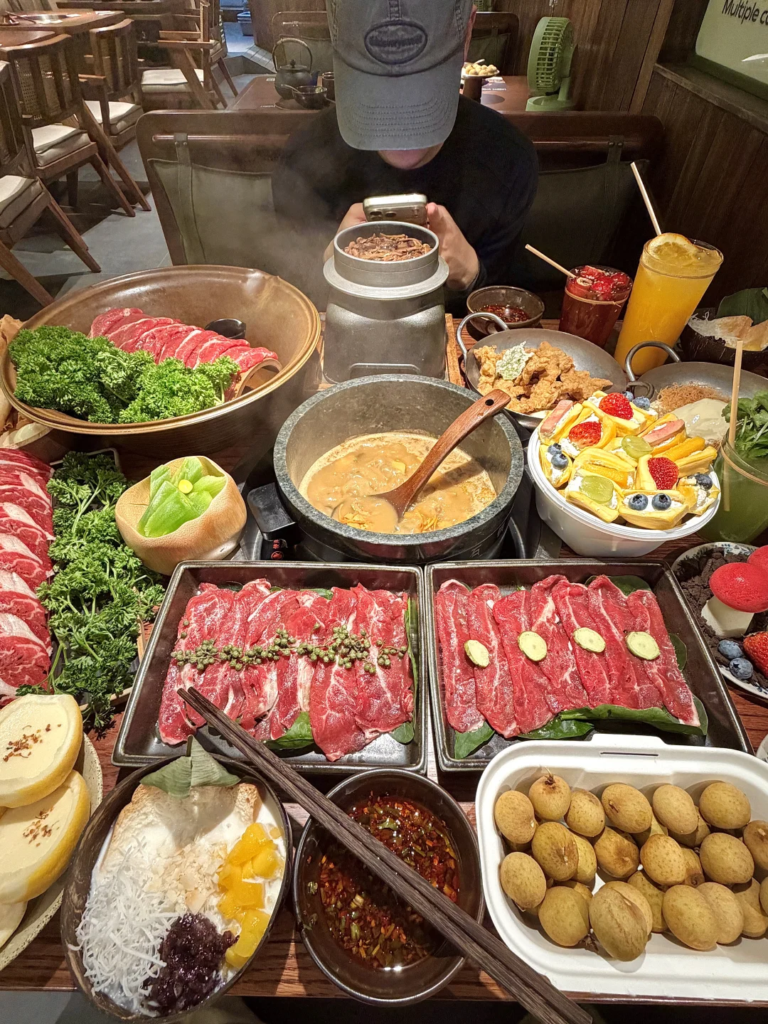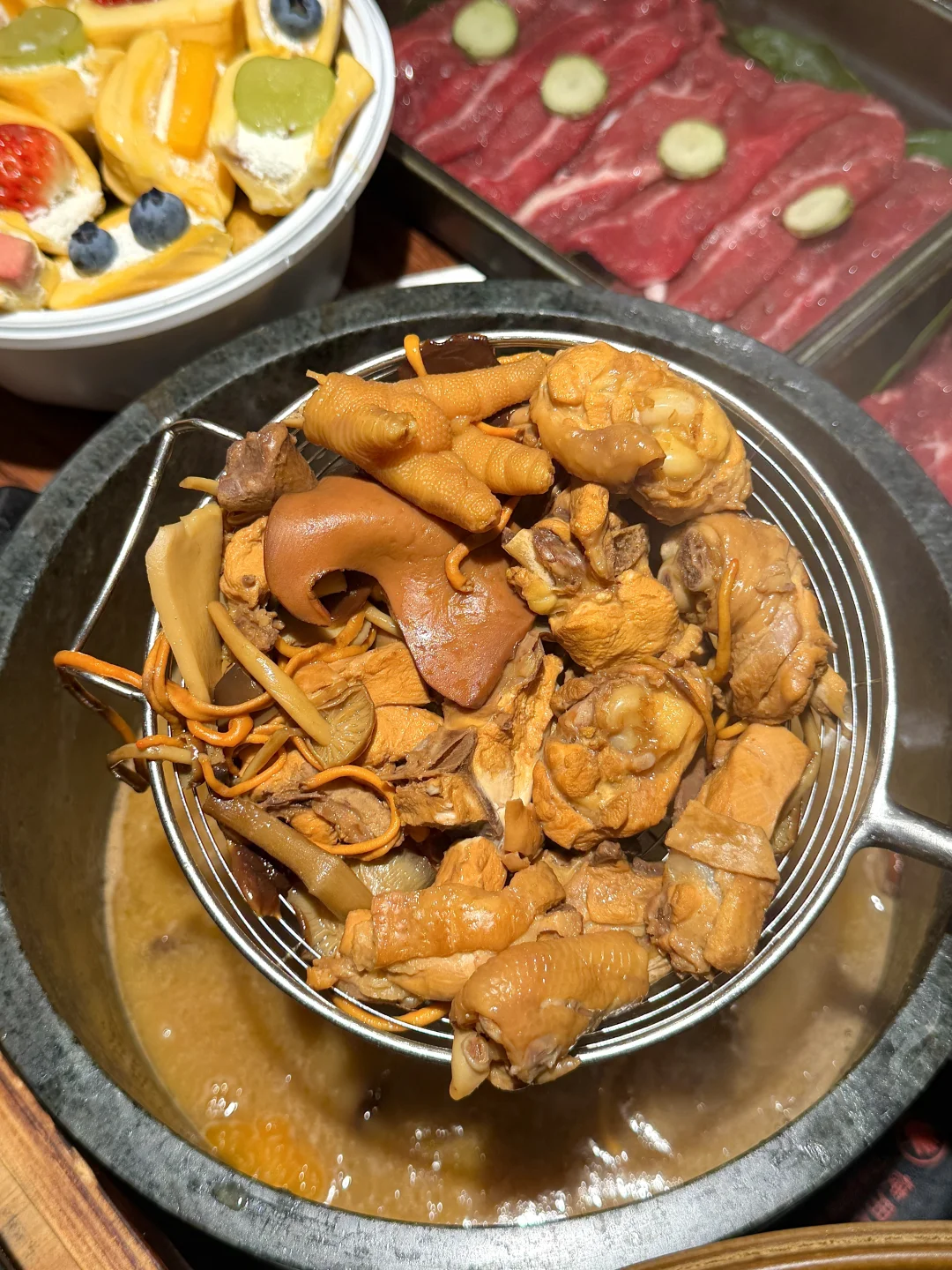 玫瑰乳扇酒酿冰汤圆,奶味真的好浓~ 有点像酸奶又像布丁,加了玫瑰、冰汤圆~入口香甜糯叽叽的!冰冰凉我好爱🥹🥹 他家主打的云南菌汤火锅也好好吃!鲜切牛肉品质敲棒!鸡肉煮出来好香🤤还有饭后小甜品柠檬奶酪、奶白米酒、泡鲁达也好好吃啊啊(蘑诉)