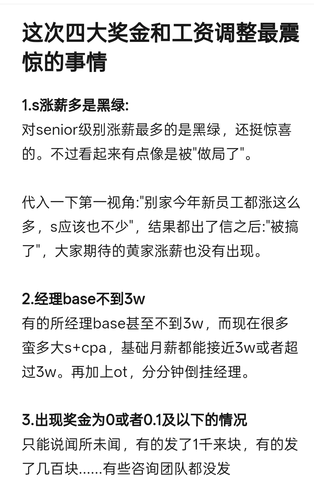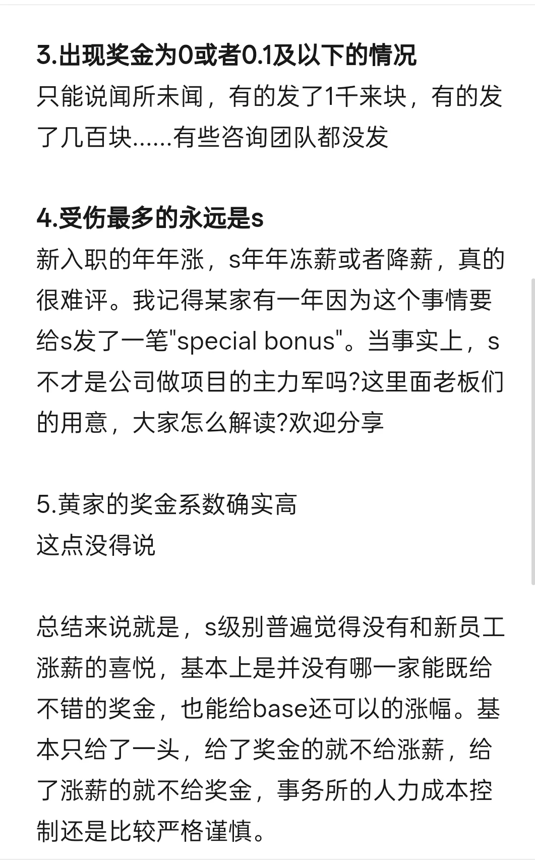 总结来说就是,s级别普遍觉得没有和新员工涨薪的喜悦,基本上是并没有哪一家能既给不错的奖金,也能给base还可以的涨幅。基本只给了一头,给了奖金的就不给涨薪,给了涨薪的就不给奖金,事务所的人力成本控制还是比较严格谨慎。