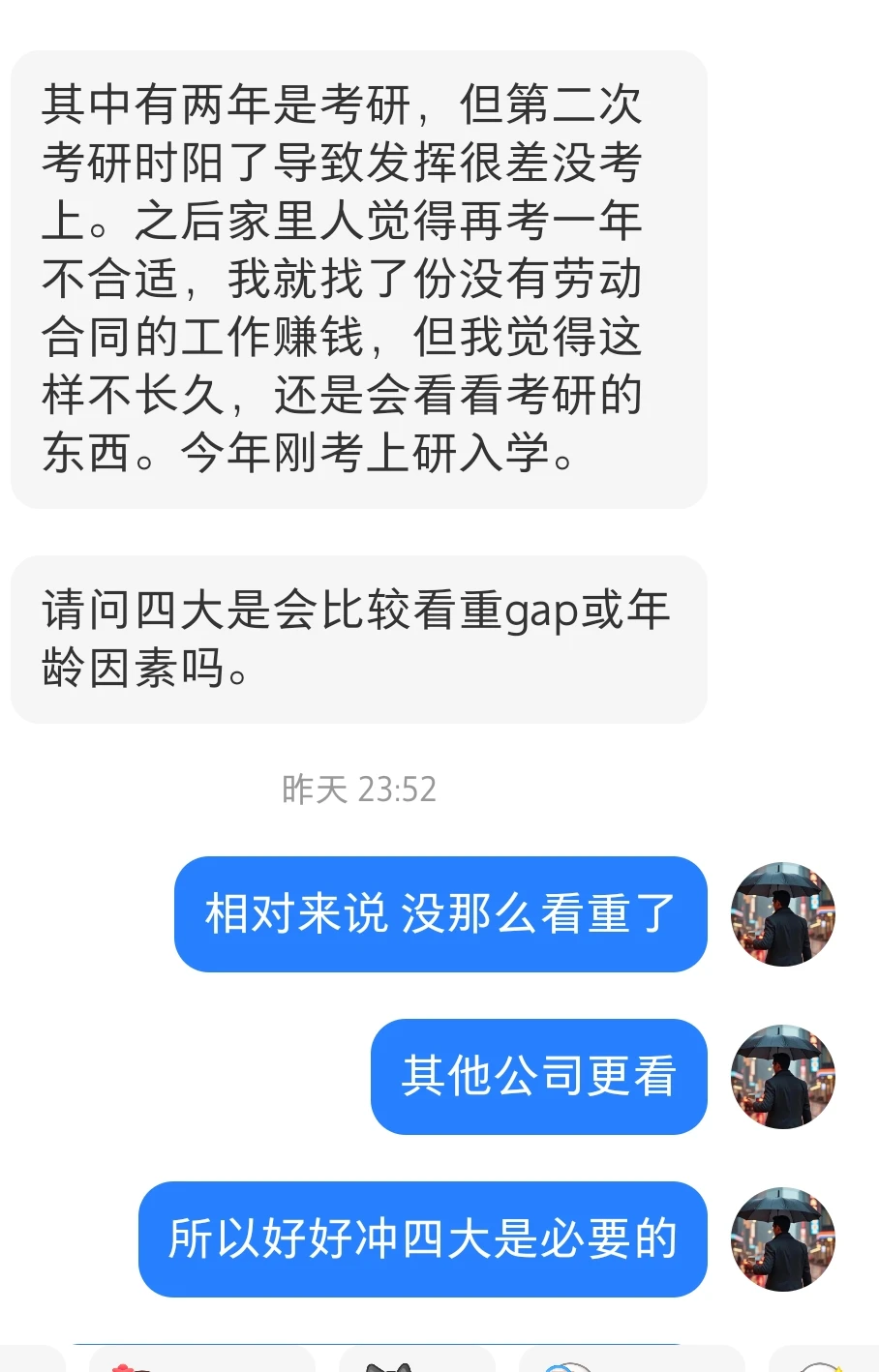 我估计好好实习还是问题不大的,四大对于年龄还是比较包容的,就是进去了可能会背同级别的人蚊,但也别放在心上,每个人都有自己的故事和路,加油吧。
