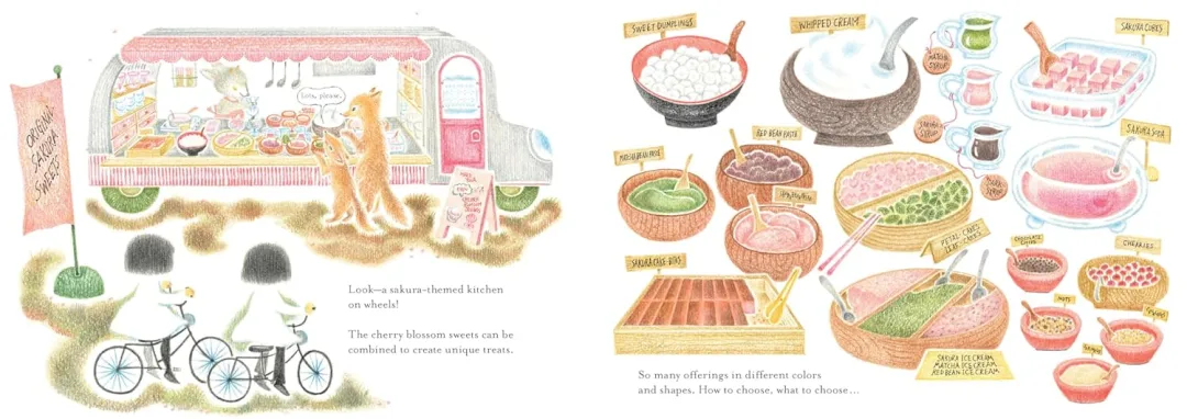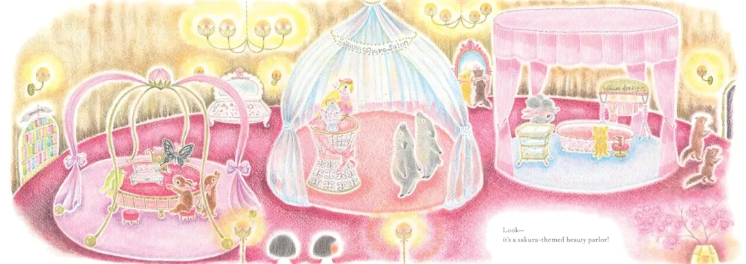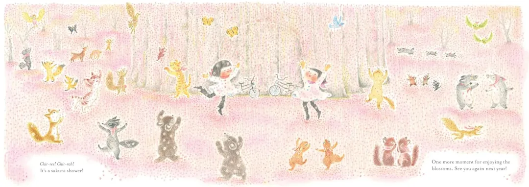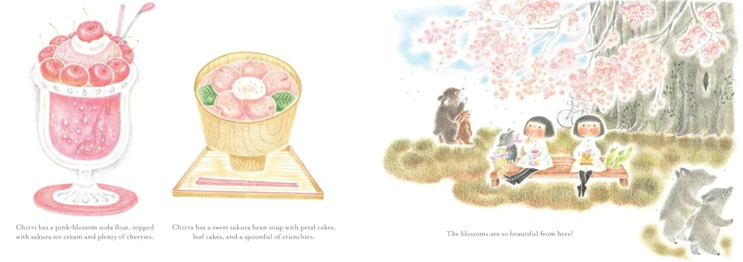 这天,花瓣飘落的时候,Chirri和Chirra骑着心爱的自行车,一路探寻来到一棵巨大的樱花树下,在这里大家在举行赏樱会。在这里,她们先品尝了香甜可口的樱花甜点,随后意外发现樱花树内部藏着一间樱花主题的美容院。换上轻盈的雪纺围巾,喷上甜甜的香水后,两人前往观景台,一边品啜清香的樱花茶,一边静静等候最美的瞬间——一阵微风拂过,漫天樱花花瓣簌簌飘落,如一场绚烂的花雨,温柔笼罩整个世界。