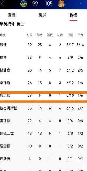 10投2中,正负值-13。库里伤停,科尔把宝押在他身上,结果直接崩盘。 空位三分哐哐打铁,持球突破就是失误。别看数据有5个抢断,防守端一步就被过,成了湖人队的提款机。他在场上,勇士就在输分。 本来勇士就没人了,库里膝盖受伤,全队指望有人能站出来。结果替补席的穆迪都轰下25分了,被科尔寄予厚望的梅尔顿,却在场上梦游。 这球输的,到底是科尔看错了人,还是梅尔顿自己不争气?