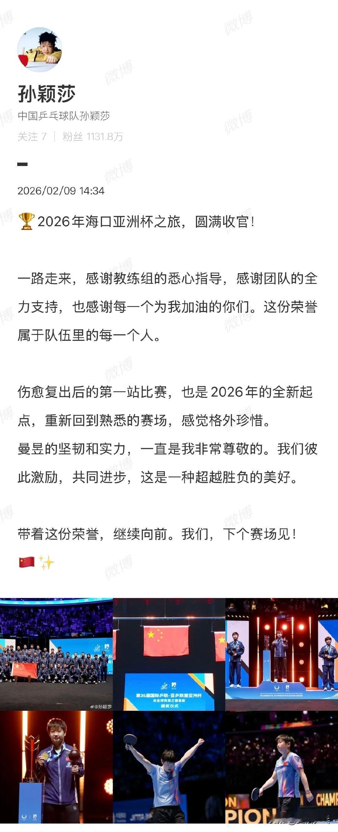 【孙颖莎亚洲杯夺冠后发文】 2月9日,孙颖莎亚洲杯夺冠后发文: 🏆2026年海口亚洲杯之旅,圆满收官! 一路走来,感谢教练组的悉心指导,感谢团队的全力支持,也感谢每一个为我加油的你们。这份荣誉属于队伍里的每一个人。 伤愈复出后的第一站比赛,也是2026年的全新起点,重新回到熟悉的赛场,感觉格外珍惜。 曼昱的坚韧和实力,一直是我非常尊敬的。我们彼此激励,共同进步,这是一种超越胜负的美好。 带着这份荣誉,继续向前。我们,下个赛场见! 🇨🇳✨ 2026.2.9