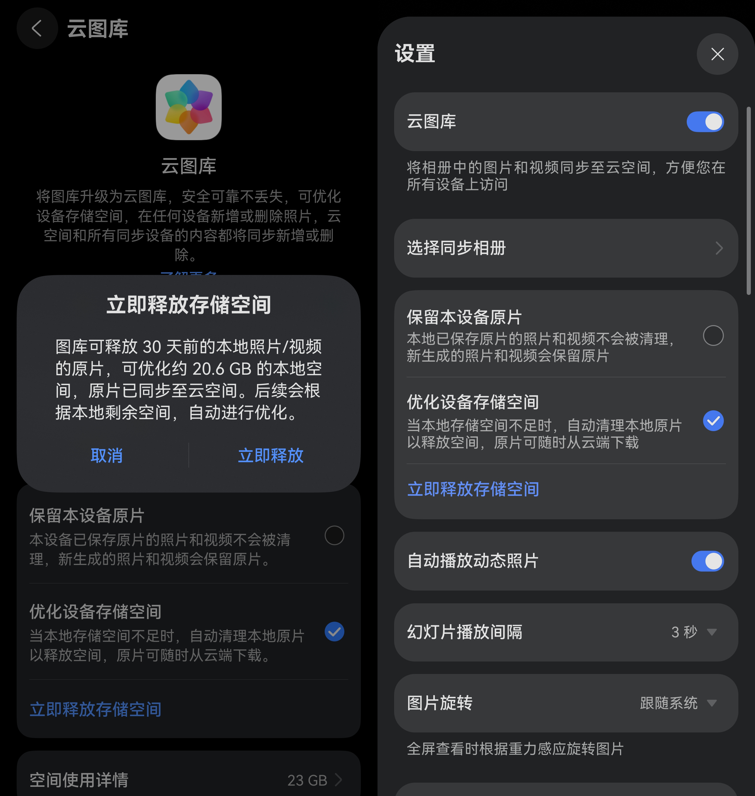 对我来说,云空间里最实用的功能就是云图库了。只要打开云图库,手机里的照片和视频就会自动同步到云端,而且还是高清版本。担心手机空间告急?直接打开“优化设备存储空间”,系统会自动把旧照片替换成小尺寸的预览版,手机一下子就能腾出地方,而且高清原图随时都能下载回来。