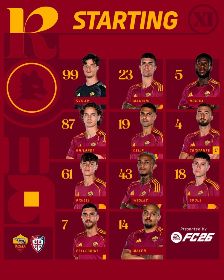 罗马首发:99-斯维拉尔;23-詹卢卡·曼奇尼、5-恩迪卡、87-吉拉迪、19-切利克;4-克里斯坦特、61-皮西利、43-韦斯利、18-苏莱、7-佩莱格里尼;14-马伦。