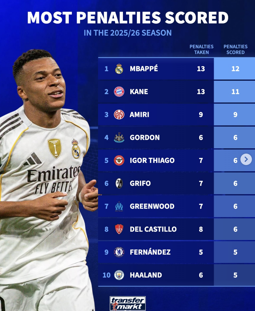 姆巴佩13罚12中居首;凯恩13罚11中排名第二;阿米里9罚9中排第三。