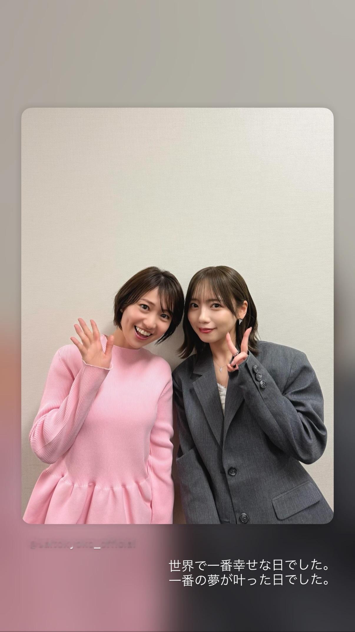 齊藤京子「この世界に進むきっかけとなってくださった存在で、15年前から長年憧れ続けていた大島優子さんに、ついにお会いすることができました。当時は大島さんが生活の中心になる程、ものすごく熱中していてそこでアイドルという職業を知り、夢を持つようになりました。まさか同じ世界でお会いできる日が来るとは思っておらず、あまりにも幸せで、言葉が追いつかない時間でした。この瞬間を一生大切にします。忘れられない時間を、本当にありがとうございました。」
