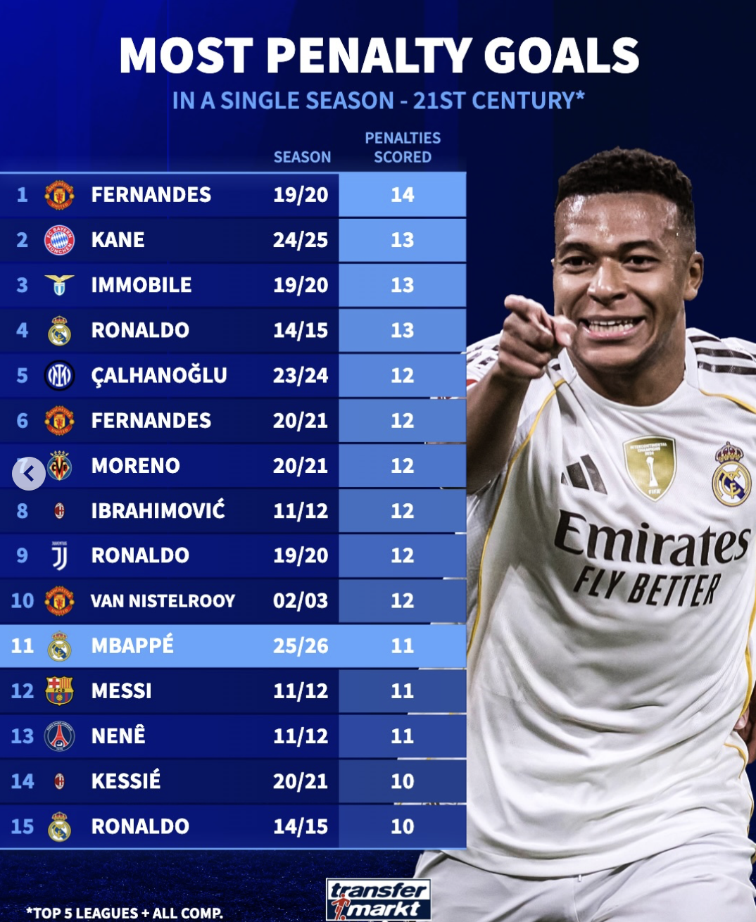 19/20赛季的B费打入14粒点球居首。24/25赛季的凯恩、19/20赛季的因莫比莱和14/15赛季的C罗各打入13球位居二到四位。