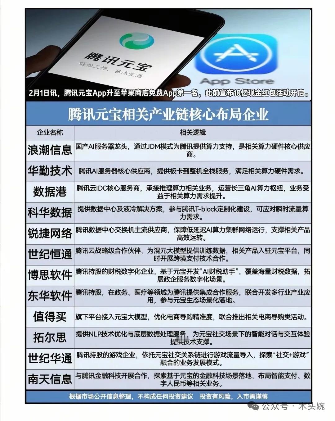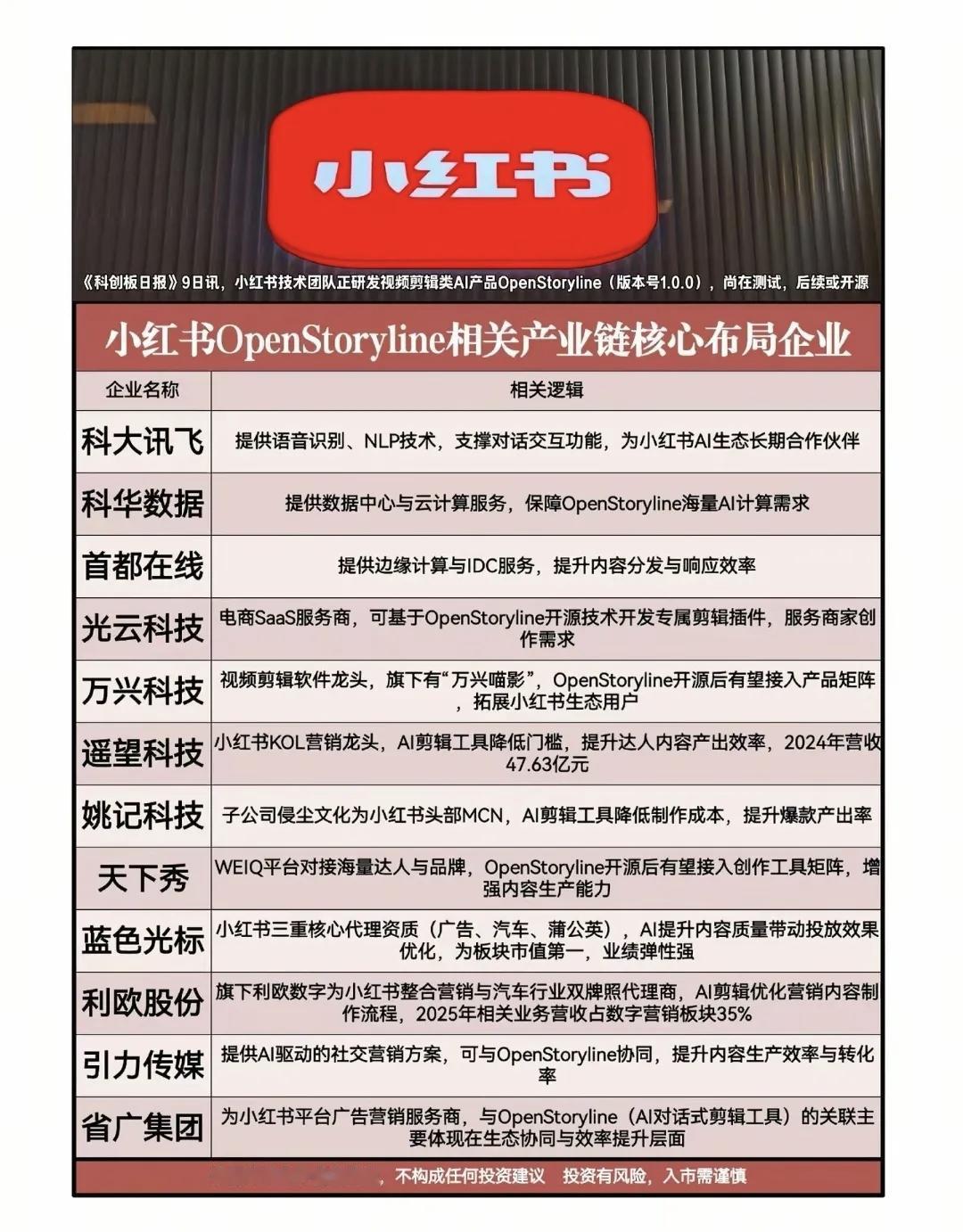 王炸利好,AI应用新技术或将带飞整个行业,小红书AI、即梦AI、智谱AI、字节AI、阿里AI相关概念龙头代表有哪些? 2月9日消息,游戏科学CEO冯骥盛赞字节Seedance 2.0,称其AI多模态能力实现飞跃,内容领域或迎结构性重构。相关概念龙头代表有风语筑、博纳、蓝色光标等等。 近日,AI应用概念利好频频:OpenAI计划本周在ChatGPT中推出新模型,技术迭代持续提速。阿里通义千问3.5发布在即,千问App下载量破千万;小红书OpenStoryline视频剪辑类AI产品测试中……(相关概念龙头名单见配图) ⚠️ 风险提示:以上信息仅供参考,不构成任何投资建议。市场有风险,投资需谨慎。