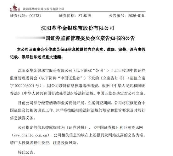 公告显示,近日,萃华珠宝收到中国证监会下发的《立案告知书》。《立案告知书》显示,萃华珠宝被中国证监会立案,原因是涉嫌信息披露违法违规。