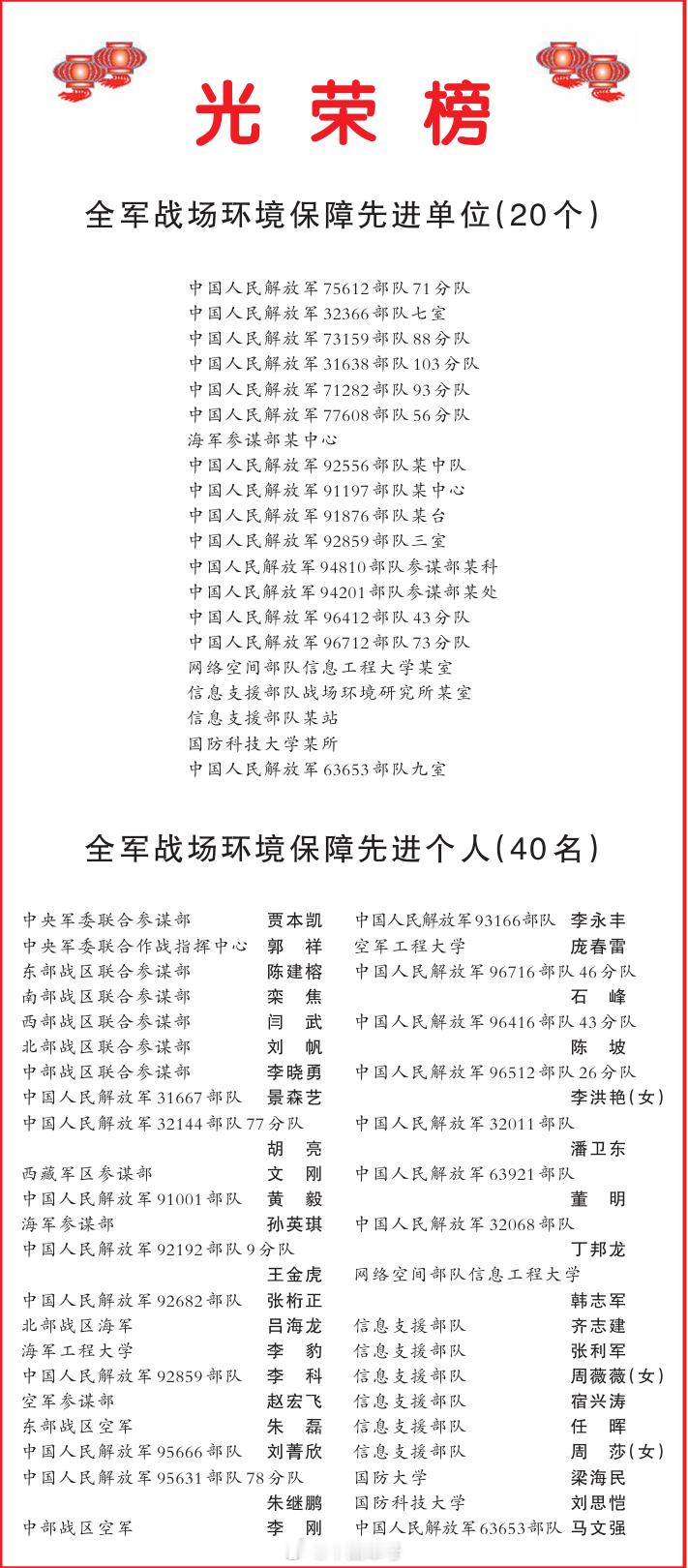 【中央军委联合参谋部、中央军委政治工作部表彰全军战场环境保障先进单位和先进个人】