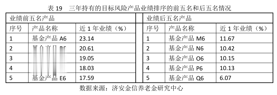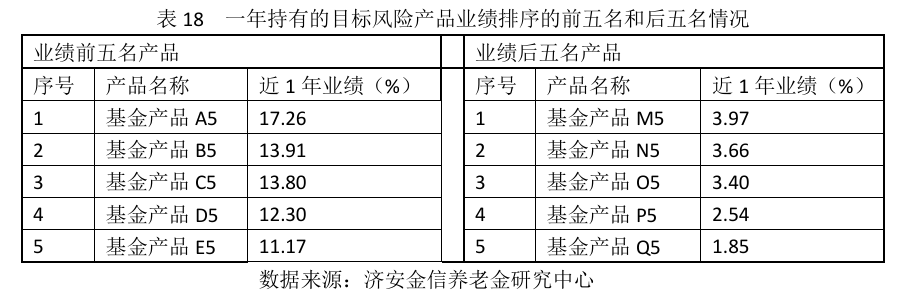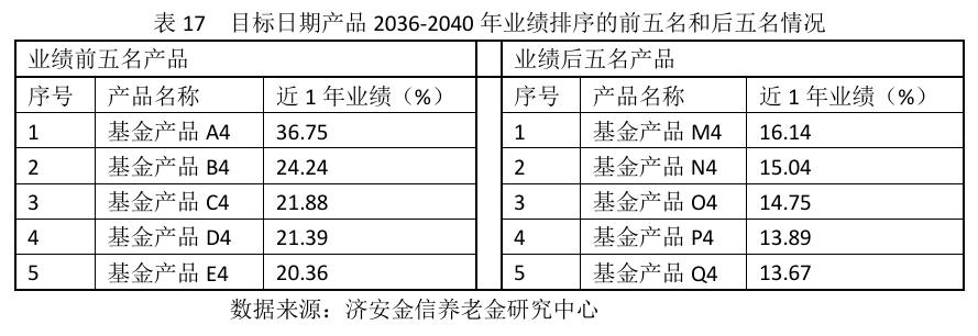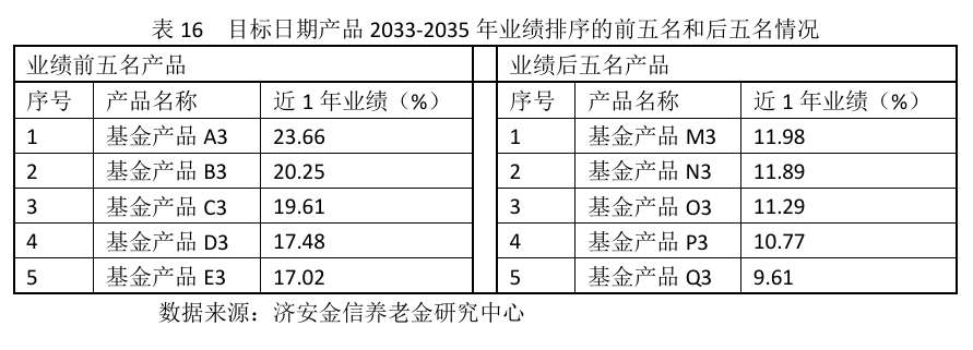 考虑到同一类型产品的业绩具有可比性,2033-2035年、2036-2040年目标日期产品,一年持有和三年持有的产品数量较多,这里列出上述四组产品业绩的前五名和后五名业绩情况。