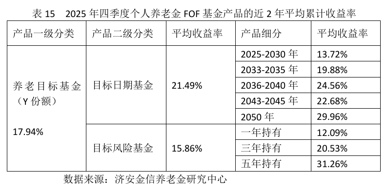 截止2025年12月31日,运作满2年的FOF基金产品数量为173只,这173只FOF基金产品近2年的投资收益业绩全部为正收益。上述运作满2年的FOF基金产品的平均累计收益率为17.94%,中位数为16.61%,最高收益率为45.79%,最低收益率为4.51%。具体如下:
