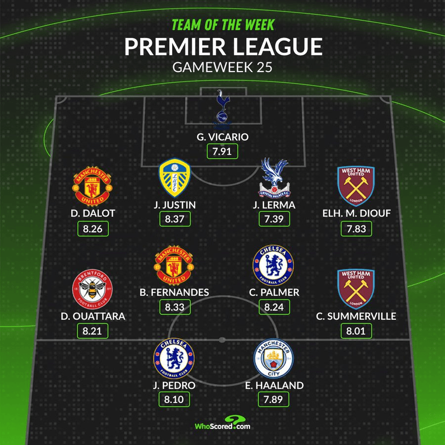 中场:瓦塔拉(布伦特福德,8.21分)、布鲁诺-费尔南德斯(曼联,8.33分)、帕尔默(切尔西,8.24分)、萨默维尔(西汉姆联,8.01分)