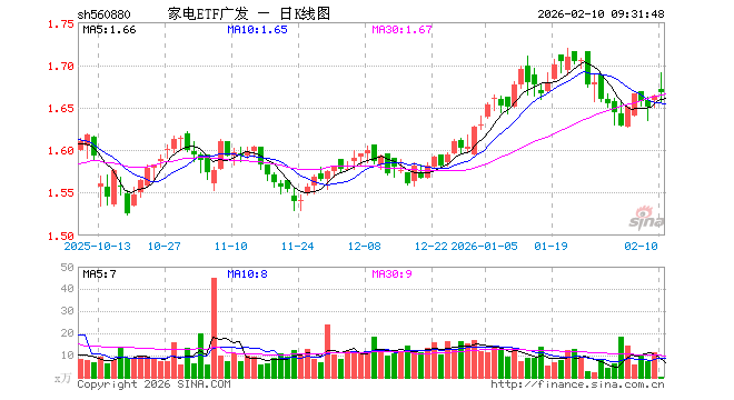 家电ETF广发(560880)业绩比较基准为中证全指家用电器指数收益率,管理人为广发基金管理有限公司,基金经理为陆志明,成立(2022-03-30)以来回报为66.35%,近一个月回报为-0.80%。