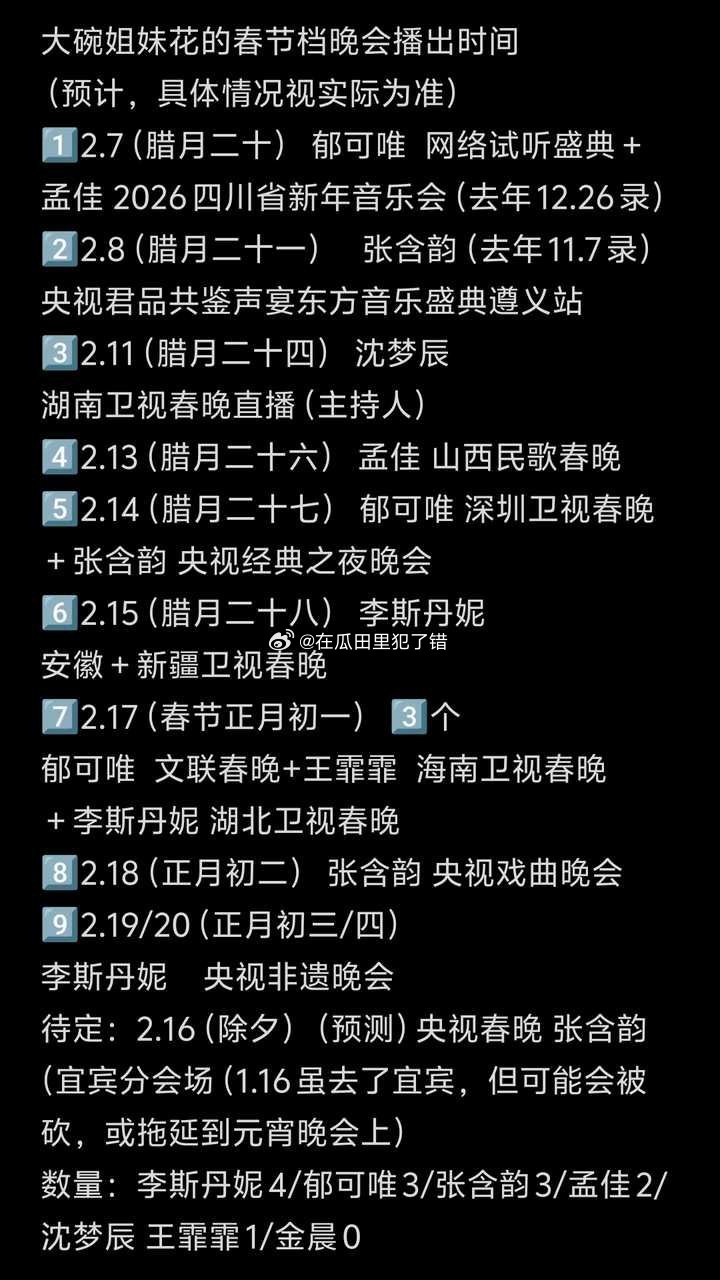 投稿,大碗姐妹花的春节晚会一览,自从金晨琐事后一个舞台都没了,张含韵李斯丹妮孟佳王霏霏都有舞台。