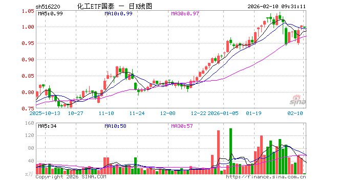 2月10日,化工ETF国泰(516220)开盘跌0.20%,报1.000元。化工ETF国泰(516220)重仓股方面,万华化学开盘跌0.41%,盐湖股份跌0.12%,藏格矿业涨0.37%,天赐材料跌0.51%,巨化股份涨0.08%,恒力石化涨0.20%,华鲁恒升跌0.17%,宝丰能源涨0.39%,云天化跌0.45%,金发科技涨0.05%。