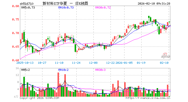 2月10日,新材料ETF华夏(516710)开盘涨0.27%,报0.741元。新材料ETF华夏(516710)重仓股方面,北方华创开盘涨0.82%,宁德时代跌0.99%,万华化学跌0.41%,隆基绿能跌0.94%,华友钴业跌0.11%,天赐材料跌0.51%,三环集团涨1.44%,通威股份跌0.84%,三安光电涨0.56%,宝丰能源涨0.39%。