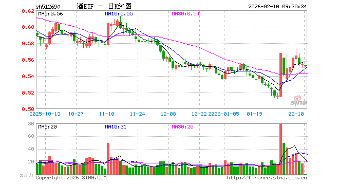 2月10日,酒ETF(512690)开盘跌0.18%,报0.553元。酒ETF(512690)重仓股方面,贵州茅台开盘涨0.00%,五粮液跌0.17%,泸州老窖跌0.24%,山西汾酒跌0.40%,洋河股份跌0.22%,今世缘跌0.24%,青岛啤酒跌0.11%,古井贡酒跌0.61%,燕京啤酒涨0.23%,舍得酒业跌0.58%。