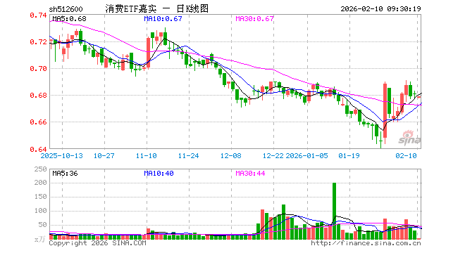 2月10日,消费ETF嘉实(512600)开盘跌0.44%,报0.678元。消费ETF嘉实(512600)重仓股方面,伊利股份开盘跌0.18%,贵州茅台涨0.00%,牧原股份跌0.41%,五粮液跌0.17%,温氏股份涨0.00%,泸州老窖跌0.24%,山西汾酒跌0.40%,海天味业涨0.51%,东鹏饮料跌0.20%,海大集团涨0.00%。