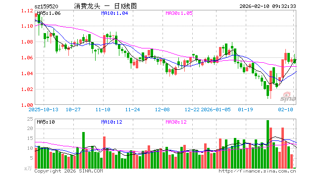 2月10日,消费龙头ETF工银(159520)开盘涨0.09%,报1.058元。消费龙头ETF工银(159520)重仓股方面,贵州茅台开盘涨0.00%,美的集团涨0.06%,伊利股份跌0.18%,格力电器涨0.00%,牧原股份跌0.41%,福耀玻璃涨0.03%,赛力斯涨0.90%,海尔智家涨0.31%,中国中免跌0.36%,温氏股份涨0.00%。