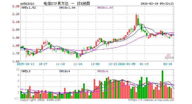 2月10日,电信ETF易方达(563010)开盘涨0.00%,报1.940元。电信ETF易方达(563010)重仓股方面,中国移动开盘跌0.04%,中国联通涨0.00%,中国电信涨0.00%,中国卫通涨0.00%,中际旭创跌0.78%,银之杰跌0.25%,新易盛涨0.52%,中兴通讯跌0.30%,天孚通信跌2.17%,中天科技跌0.60%。