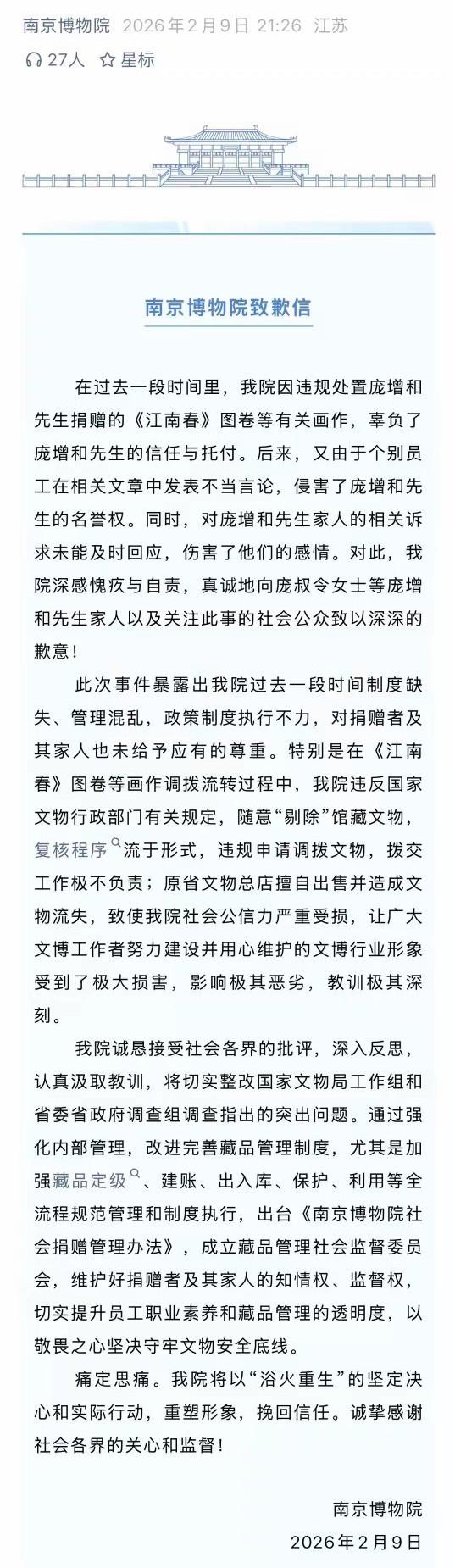 南京博物院承认《江南春》图卷等多幅画作的调拨、流转中存在违纪违法问题,原院长徐湖