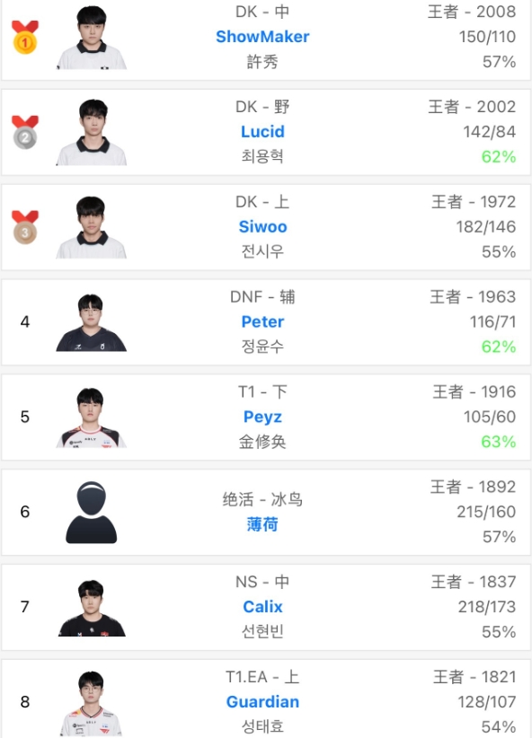 韩服排行榜更新:DK上中野包揽前三 Peter来到第四 Peyz来到第五啦!