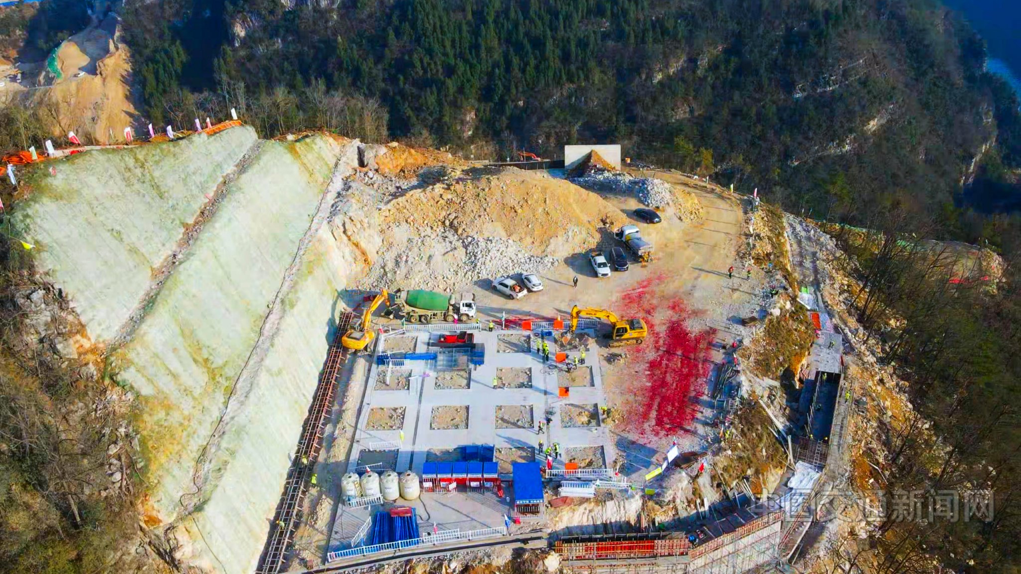 三峡大桥北岸主墩共设有32根桩基,采用分离式承台配群桩基础,单个承台下设16根直径3.4米的钻孔灌注桩,最深12米。为确保首轮桩基顺利开钻,项目团队统筹规划、科学部署,历时6个月,在70度的陡坡上开挖了一条长达1.3公里的施工便道。同时,团队将原有的山头削平,开辟出5138平方米的建设场地,为大型设备的进场创造了有利条件。