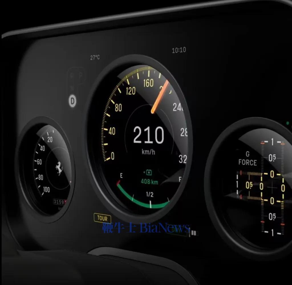 仪表盘:可随方向盘同步移动,保证最佳观看视角;搭载两块重叠式三星OLED屏,屏幕预留三处镂空,可显露出后方第二块屏幕,同样为全球首创。该超轻面板由法拉利与三星显示工程师联合定制开发。