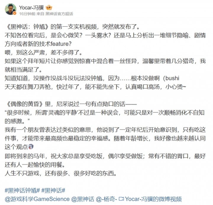 直播吧2月10日讯今日游戏科学官方账号“黑神话”发布了《黑神话:钟馗》6分钟实机小短片,游戏科学CEO冯骥更博发长文:
