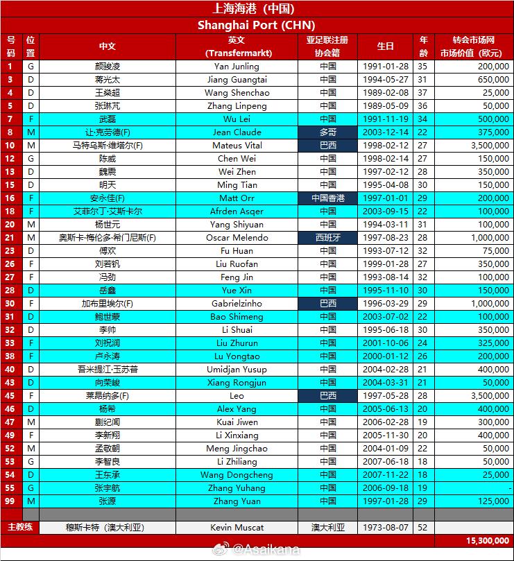 虎扑02月10日讯《转会市场》管理员朱艺在社媒公布了上海海港的亚冠精英联赛本阶段名单。