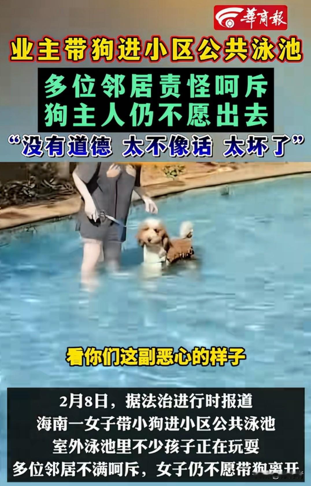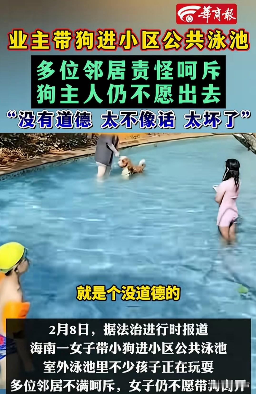 女子带宠物狗进小区公共浴池洗澡!挑衅道德底线。 被在场的人谴责,她还嘴不饶人,怒吼“看你们一副恶心人的样子!” 这事发生在海南一小区公共浴池。狗是动物,身上难免有味道、病毒或细菌。女的带狗下公共浴池洗澡,这人太坏了! 你喜欢狗在家里随便,小区浴池不是自家的卫生间。在公共场合、就应该遵守社会公德。 有网友说,“这个狗主人太自私了,给自己的狗洗澡,也不怕伤害到别人。” “所有不文明养狗的人,都是精致利己主义者。把自己的愚昧和无知强加给大众。” “叫她亲自放水消毒,所有费用让她自己出。”