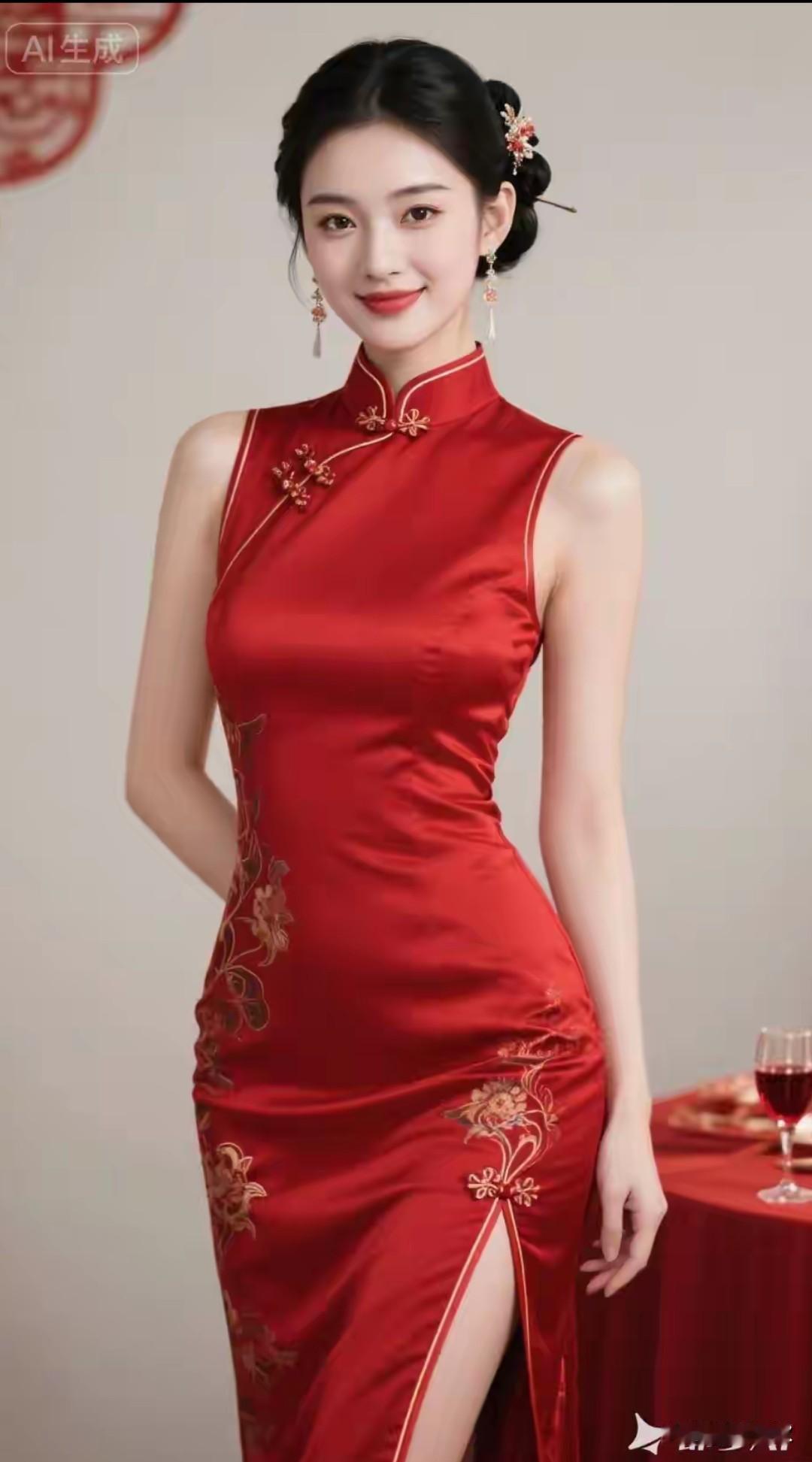 红色旗袍雅韵生, 丙午马年添喜庆。 嫣然一笑显风情, 眸若秋水映繁星。